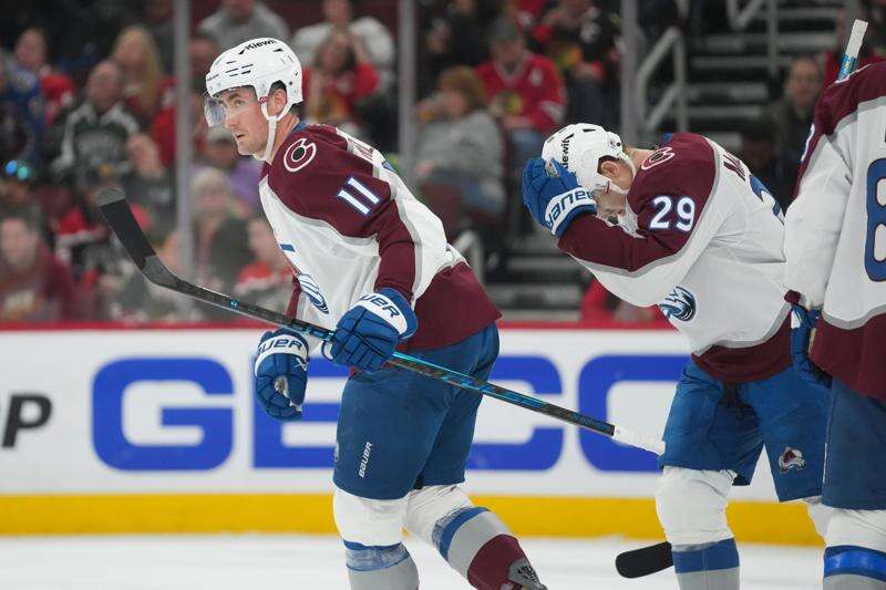 Colorado Avalanche center Brock Nelson (11) returns to the bench after scoring on the Chicago Blackhawks during the first period of an NHL hockey game Friday, March 20, 2026, in Chicago. AP