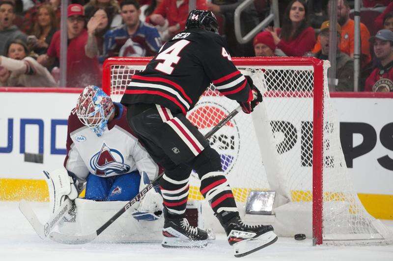 Chicago Blackhawks defenseman Wyatt Kaiser, left, scores against Colorado Avalanche goaltender MacKenzie Blackwood, right, during the second period of an NHL hockey game Friday, March 20, 2026, in Chicago. AP