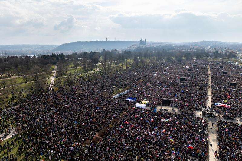 People in the crowd, who organizers estimated at 200,000, were waving Czech national flags, while one of the banners on display read: “Let’s defend democracy.”