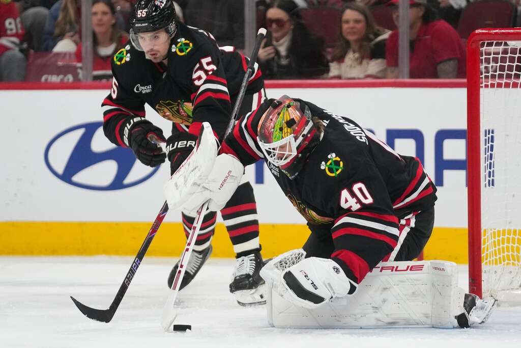 Blackhawks goaltender Arvid Soderblom makes as save during Friday’s game against the Colorado Avalanche in Chicago. AP