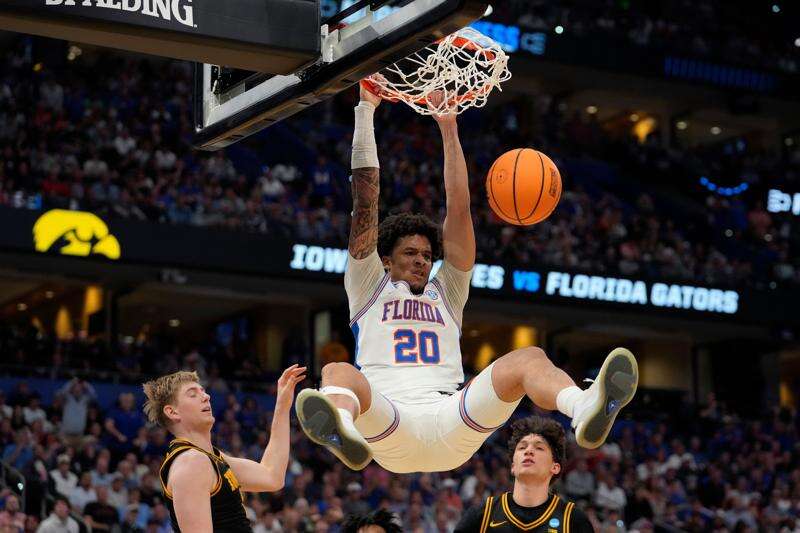 Florida guard Isaiah Brown (20) slam dunks over Iowa forward Cooper Koch and guard Isaia Howard during the second half in the second round of the NCAA college basketball tournament Sunday, March 22, 2026, in Tampa, Fla. AP