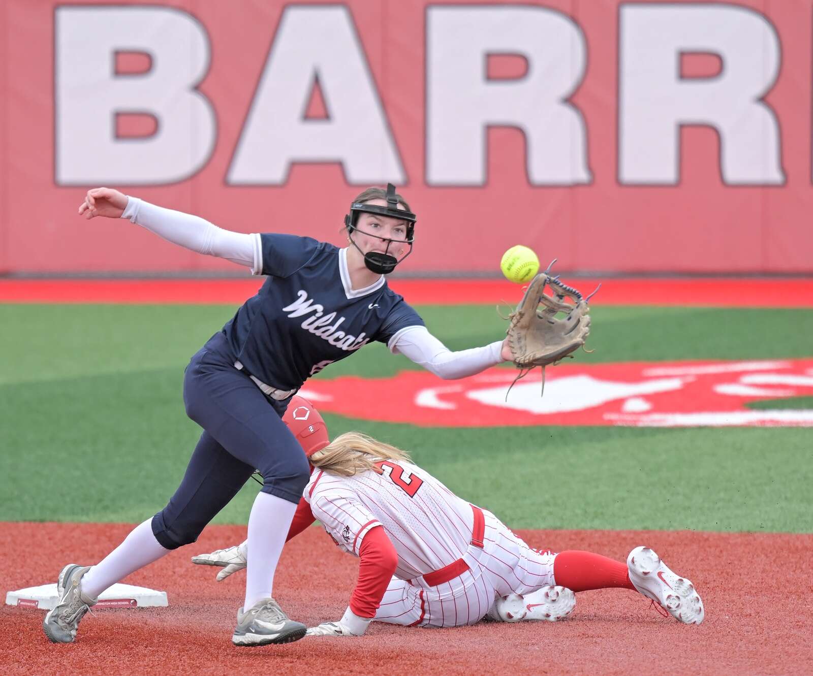 Barrington’s Shaylee Hiser gets to second base safely as West Chicago’s Sophia Ptak reaches for the throw in a softball game in Barington on Friday, Mar. 27, 2026. John Starks/jstarks@dailyherald.com
