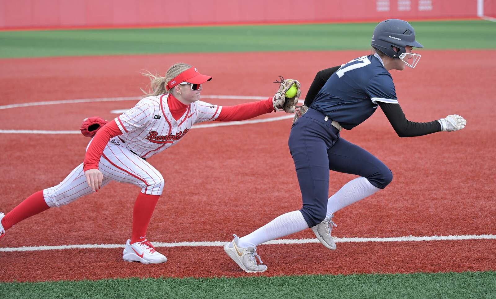 Barrington third baseman Shaylee Hiser chases West Chicago’s Brielle Borner to tag her out in a softball game in Barington on Friday, Mar. 27, 2026. John Starks/jstarks@dailyherald.com