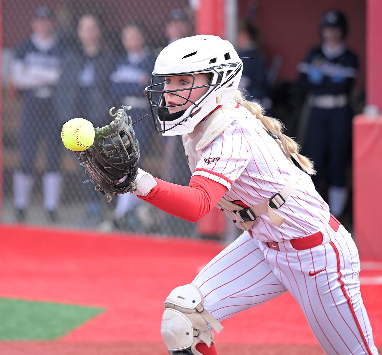 Barrington catcher Emma Zorzy tries to grab a bouncing ball that was called foul off the bat of West Chicago’s Samantha Mueller in a softball game in Barington on Friday, Mar. 27, 2026. John Starks/jstarks@dailyherald.com
