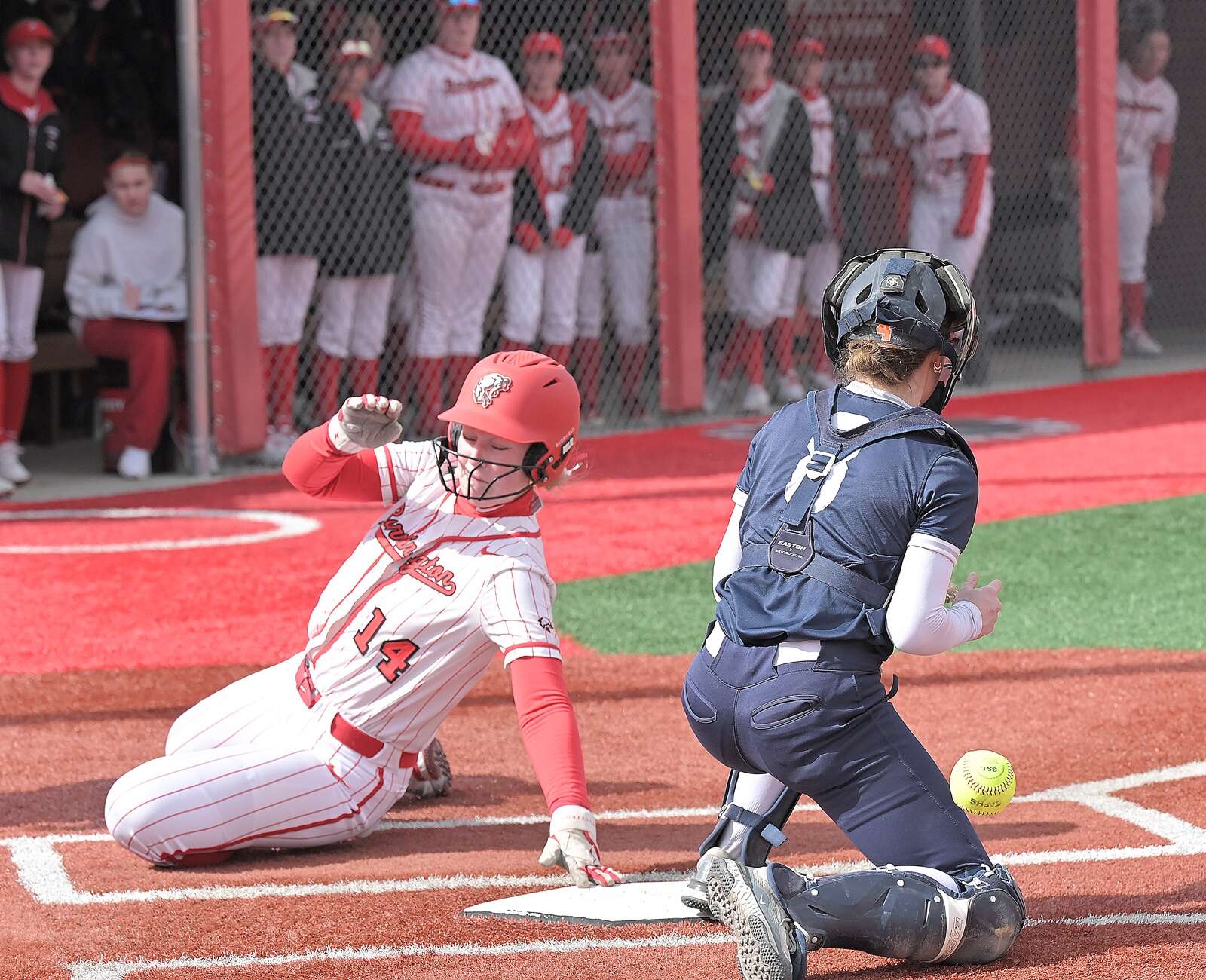 Barrington’s Shaylee Hiser stretches for home plate and scores on a passed ball against West Chicago in a softball game in Barington on Friday, Mar. 27, 2026. John Starks/jstarks@dailyherald.com