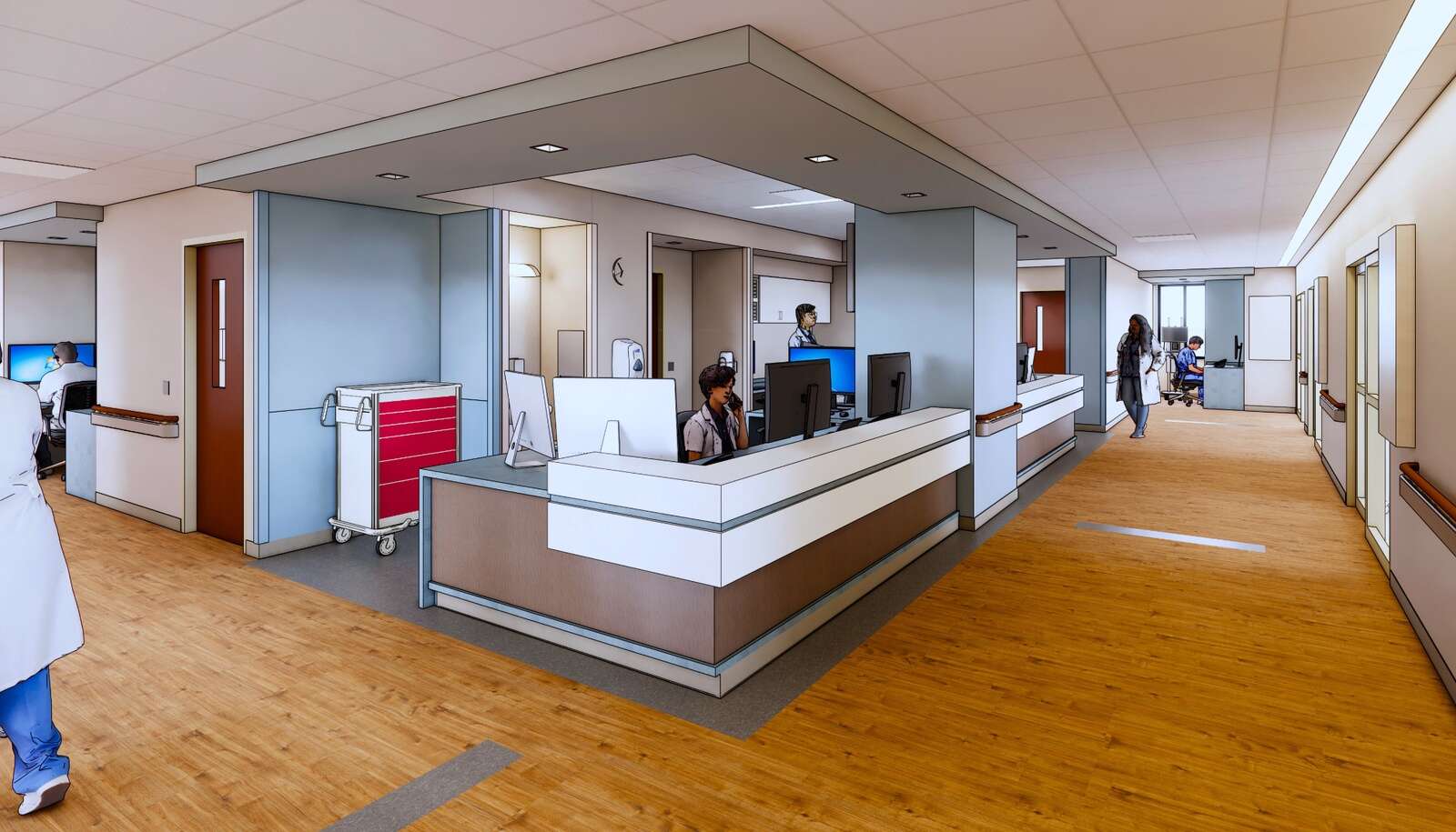 Endeavor Health will add intensive care unit beds as part of a nearly $29 million project to expand cardiovascular services at Edward Hospital in Naperville. A rendering shows an ICU nurse station. Rendering courtesy of Endeavor Health