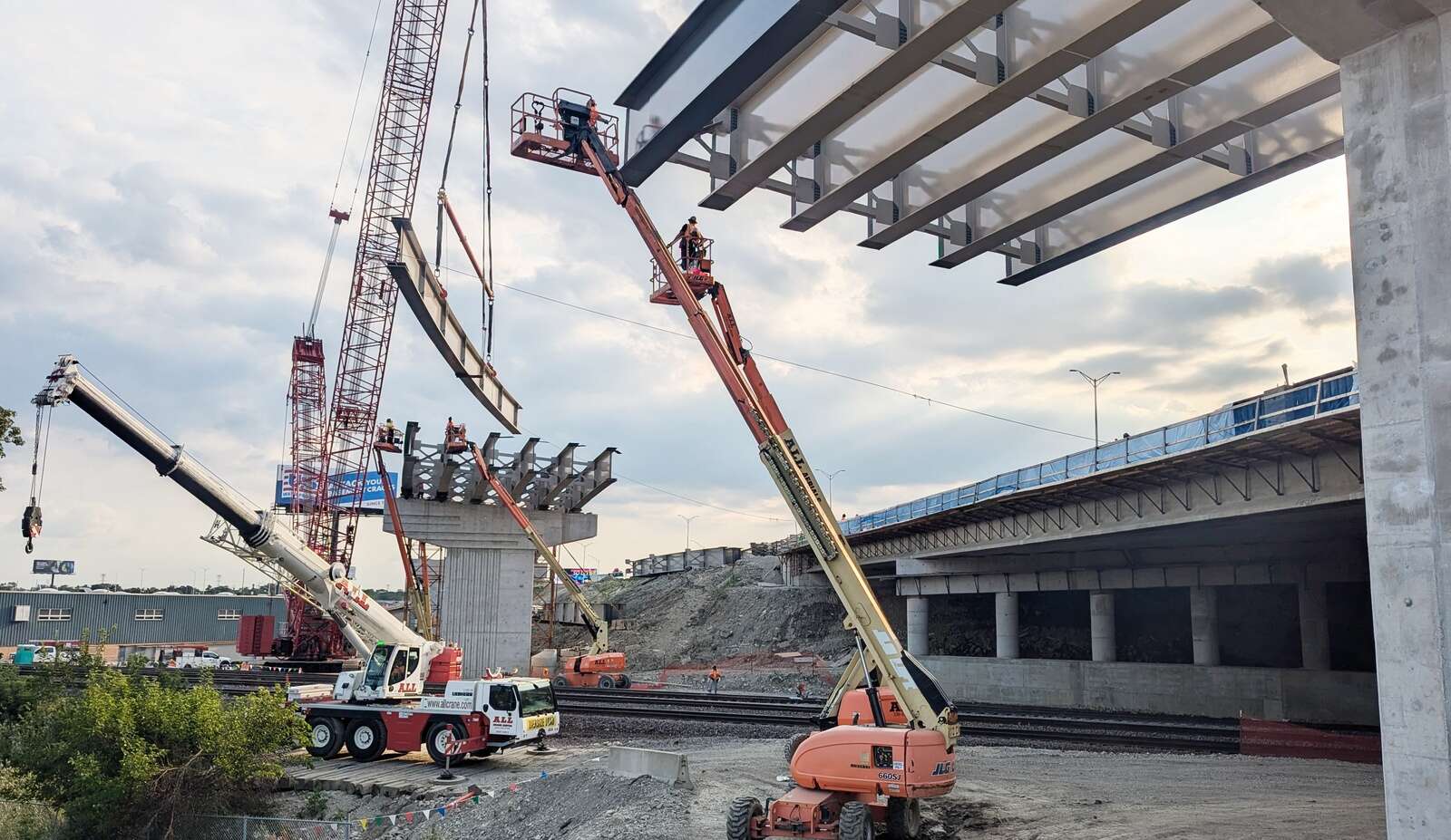 Beam placement for the I-490/I-294 Interchange near Franklin Park. Contractor Judlau has filed a lawsuit contending tollway mistakes are increasing costs and delaying construction. Courtesy of Illinois Tollway Authority, 2024
