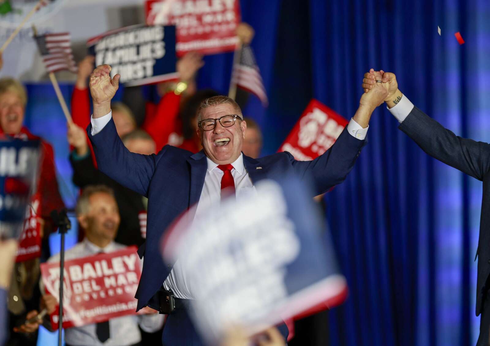 Darren Bailey and his running mate Aaron Del Mar take the stage at his election party Tuesday, Mar. 17, 2026 at the Crowne Plaza Springfield - Convention Center in Springfield.
