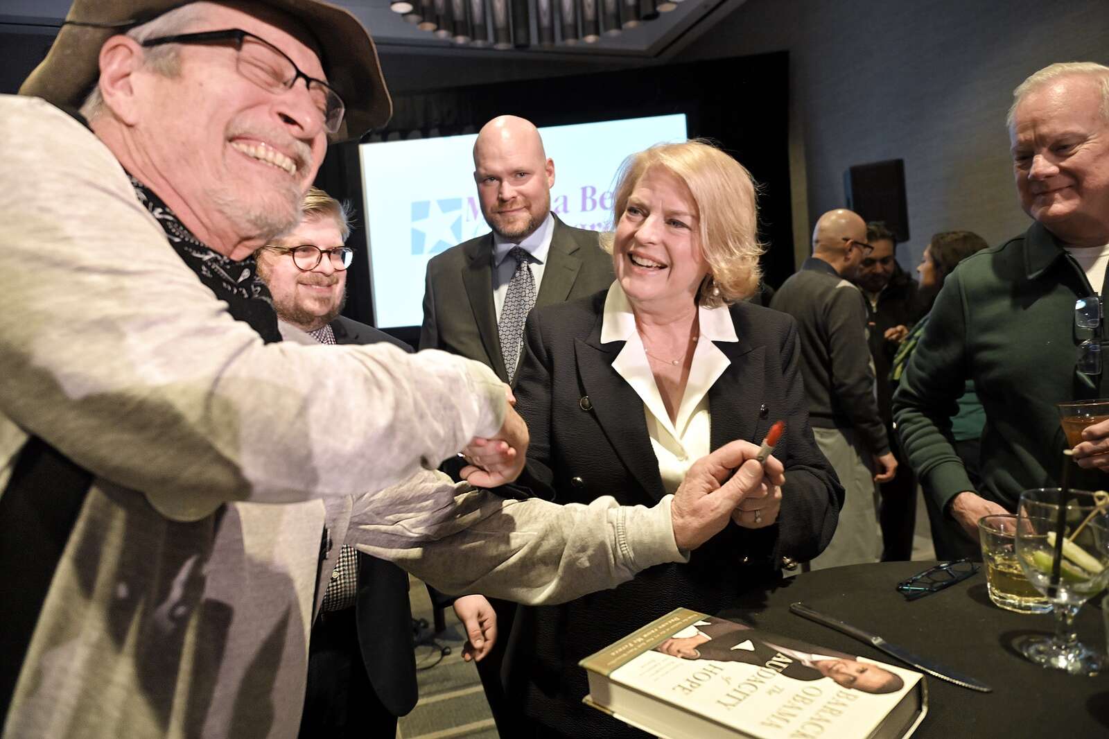 Schaumburg resident Tony Domino laughs after newly elected Congresswoman Melissa Bean signed his book beside a Barack Obama autograph at her election party at the Hyatt Regency in Schaumburg on Tuesday, Mar. 17, 226.