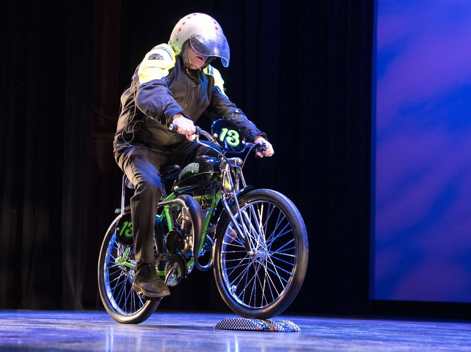 Riding his number 13 Grave Digger motorcycle, Ray Spangler,, of Schaumburg, also known as Ratso-the-Magnificent, performs a "Death Defying Motorcyle Stunt" by jumping over a tiny jump during the 11th Annual Schaumburg Senior Follies Variety Show on Sunday, Mar. 29, 2026 at the Al Larson Prairie Center for the Arts in Schaumburg. Local seniors performed a variety of acts including singers, dancers and perfromers.
