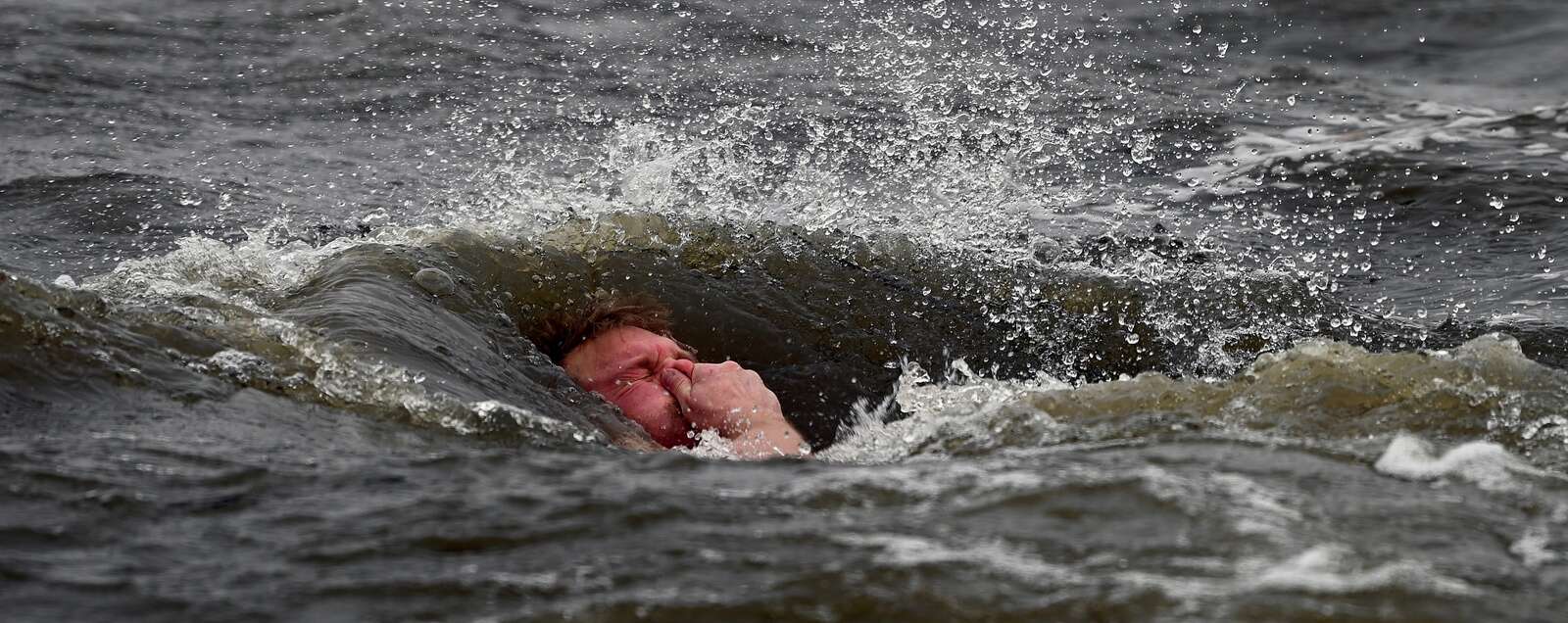 Greg Smith, of McHenry is about to fully go under the water at the Fox Lake Polar Plunge on Mar. 22, 2026 in Fox Lake.