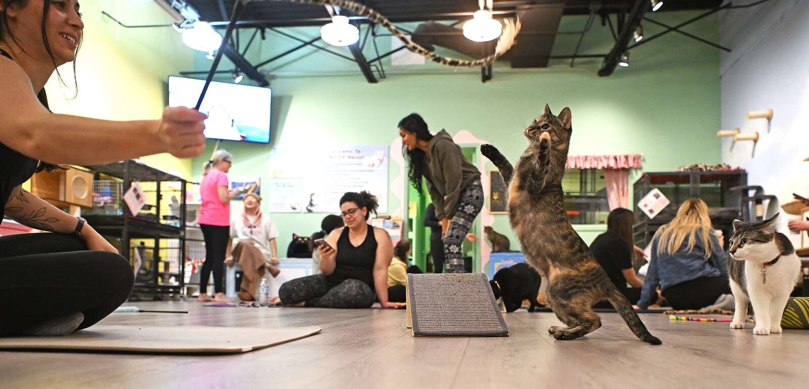 Olivia Rossi, of Elmhurst and Mercedes take a play break during a cat yoga class at The Cat House in Roselle.