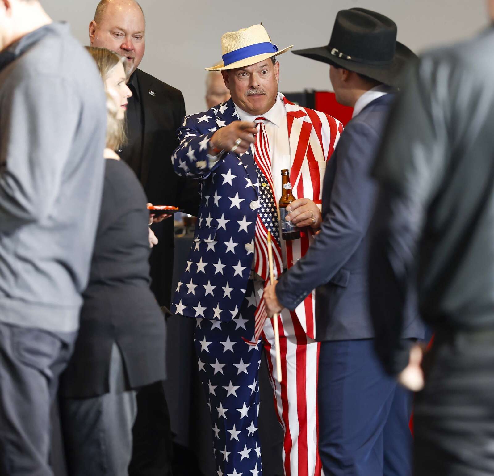 Sheldon Schulte, of Vandalia wears one of his flag suits as he talks to people at Darren Bailey’s election party Tuesday, Mar. 17, 2026 at the Crowne Plaza Springfield - Convention Center in Springfield.