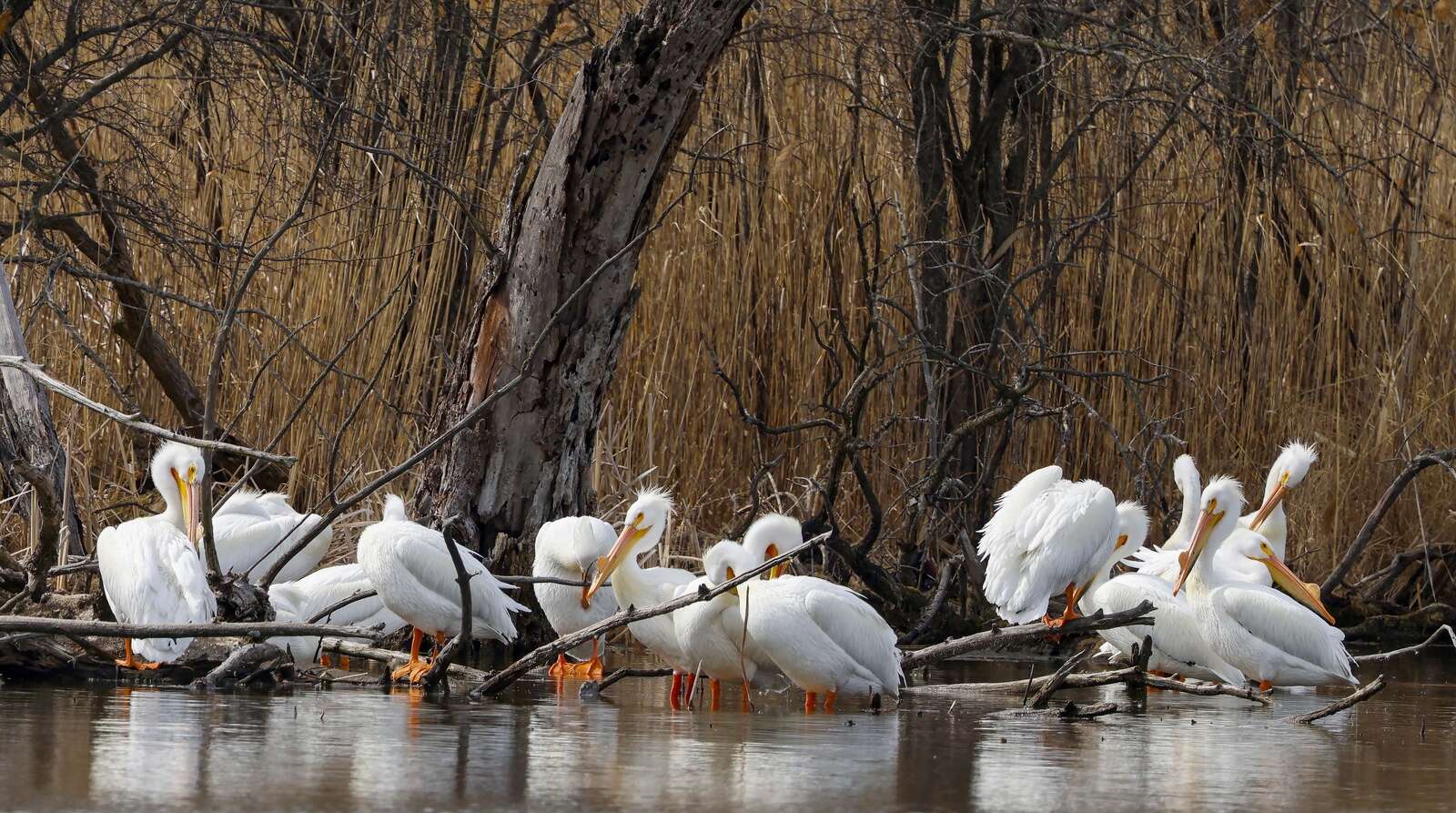 Pelicans find a spot to rest during their annual migration Wednesday, Mar. 25, 2026 on Grass Lake.