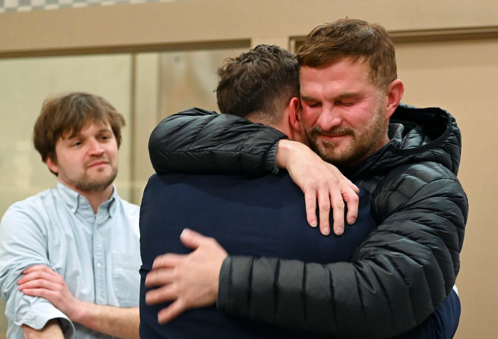 Left, Democratic candidate Kevin Morrison, of Mount Prospect has an embrace with fiance Ethan Ogborn at Belvedere Events & Catering in Elk Grove Village on Mar. 17, 2026.