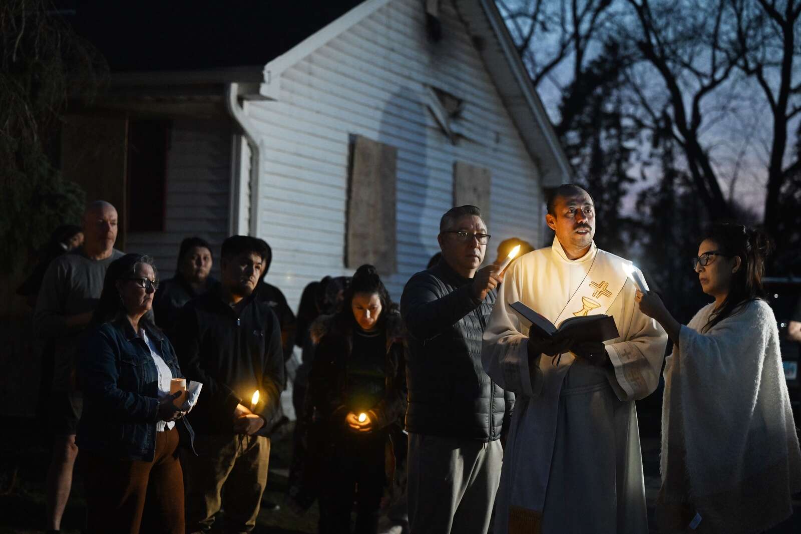Deacon Israel Santiago of Transfiguration Catholic Community, Wauconda, leads a group of nearly 150 people in prayer during a candlelight vigil on Wednesday to honor Christopher Alfaro-Rodriguez, 4, who died in a house fire in Mundelein early Monday. Gustavo and Rosa Alvarez, of Libertyville hold lighting for Santiago.