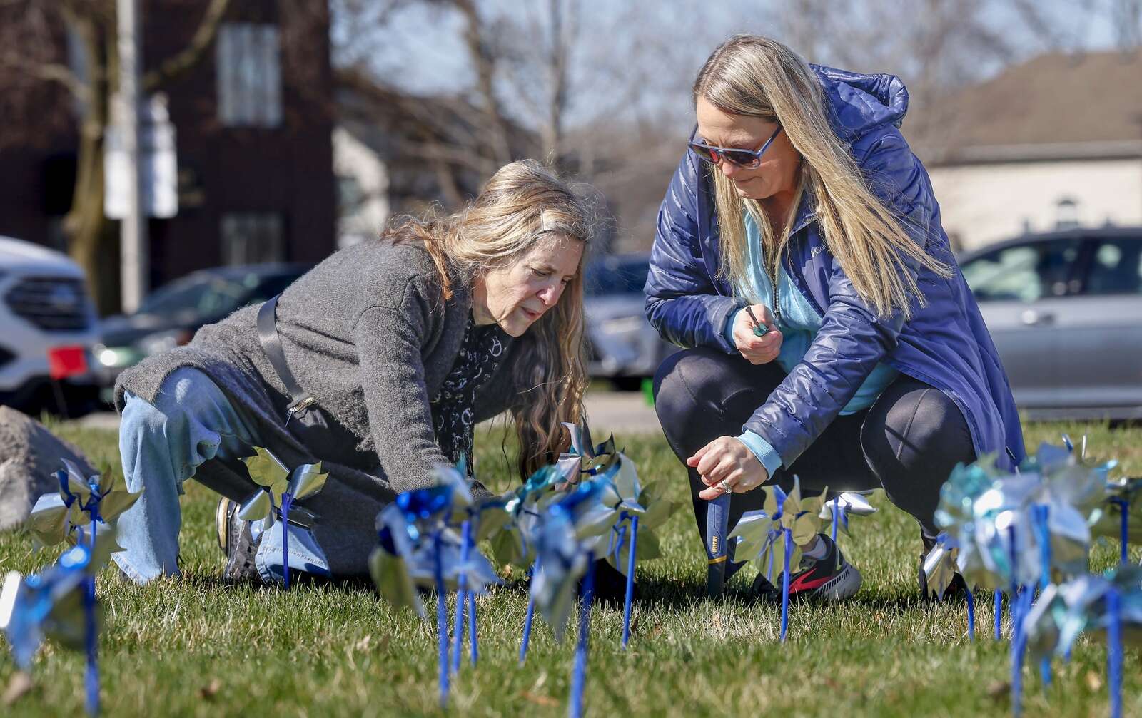 Jennifer Samartano, of Naperville and Prevent Child Abuse Illinois, left, and Jorie Meyer of Warrenville and the Wheaton Exchange Club plant pinwheels for the annual Pinwheel Garden at the DuPage County Building on the corner of Manchester and County Farm Roads to honor April as Child Abuse Prevention Month Saturday, Mar. 28, 2026 in Wheaton.