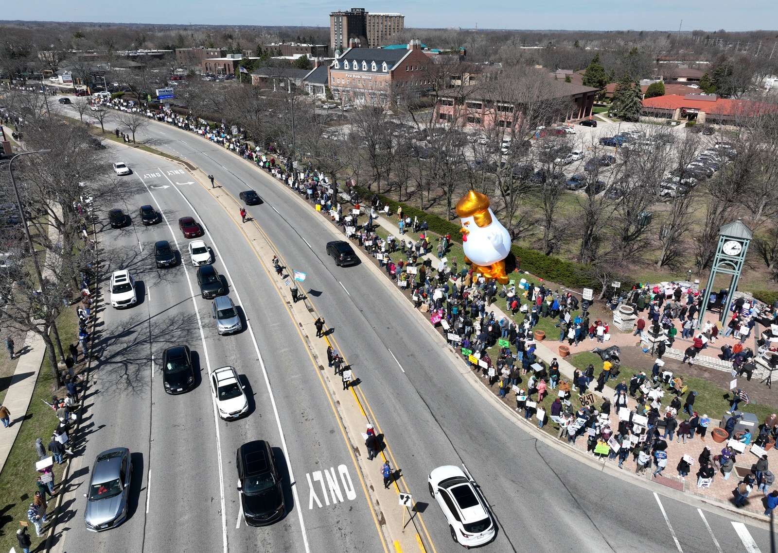 Participants line both sides of Northwest Highway at Hicks Road during a No Kings protest on Saturday, Mar. 28, 2026 in Palatine.