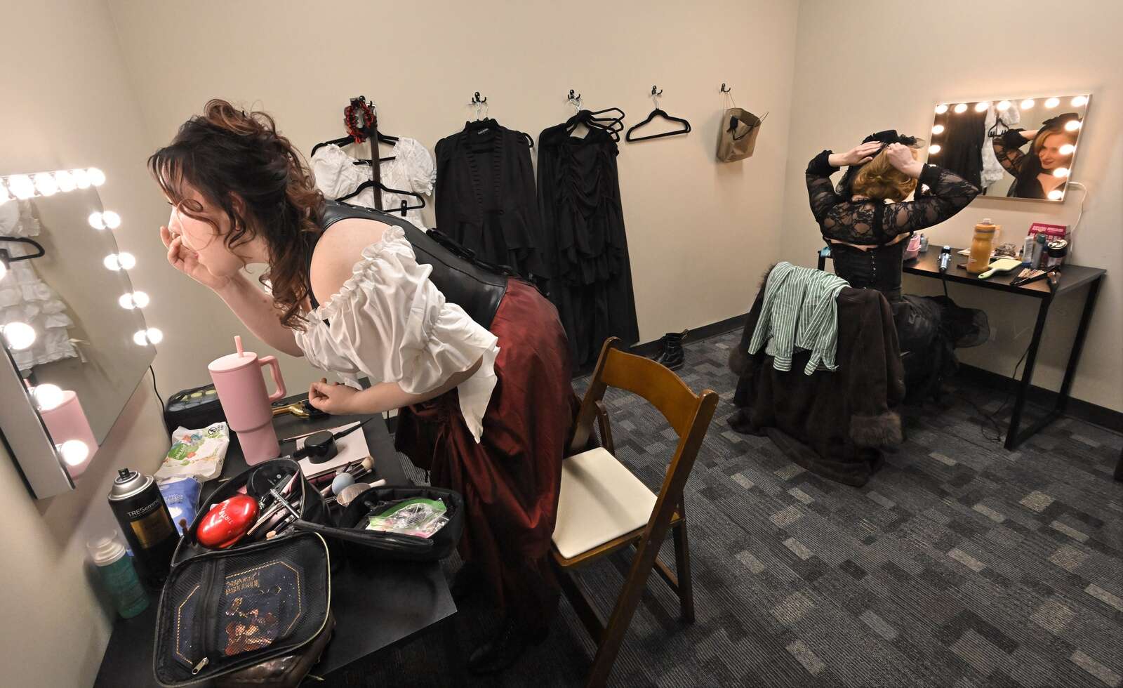 Actresses Tiffany Jasinski, left, and Danielle Spence adjust their makeup in the new dressing room in the wings of the black box theater in Elgin at 220 DuPage Street.