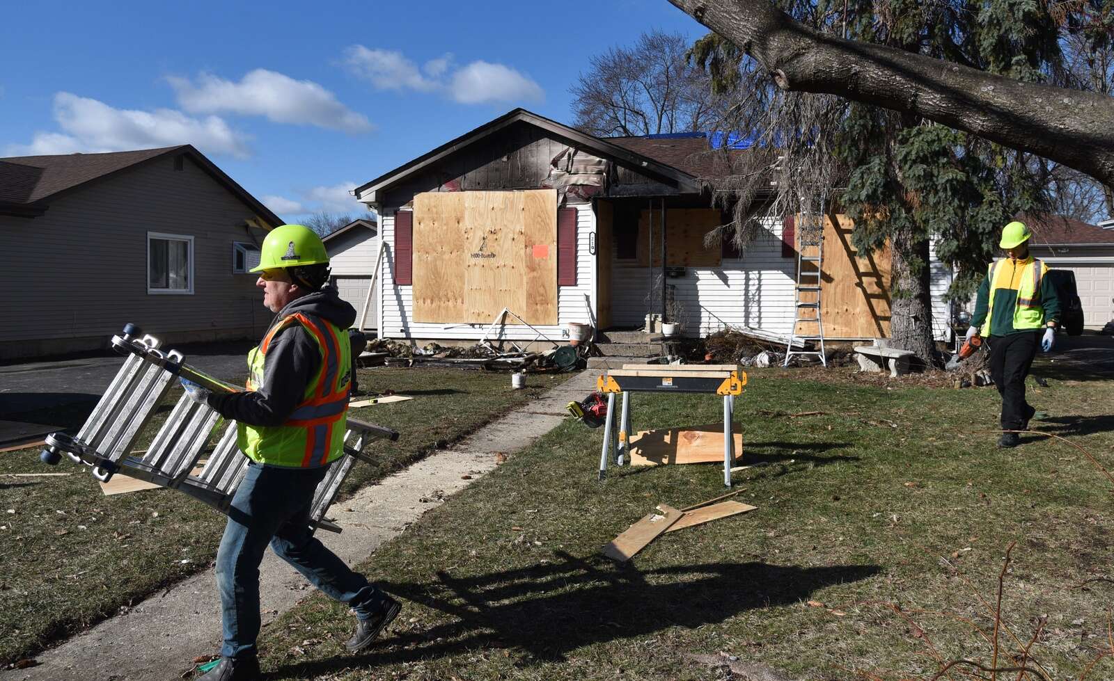 Crews finish boarding up a home where 4-year-old boy has died following a house fire on the 200 block of Dalton Ave. in Mundelein overnight.