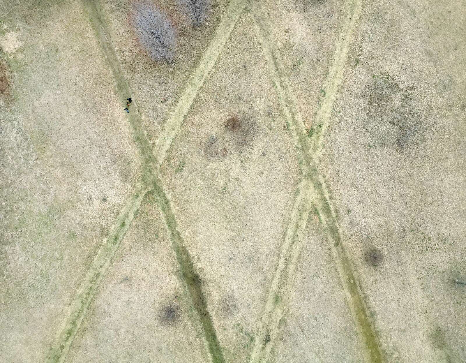 Trails criss cross for two people and a dog recently in the Lakewood Dog Park near Wauconda. This is one of five designated off-leash dog parks in the Lake County Forest Preserves. The 66-acre area is entirely fenced and features large open meadows, mowed trails, parking area, toilets, a water hand pump, and a shade shelter.