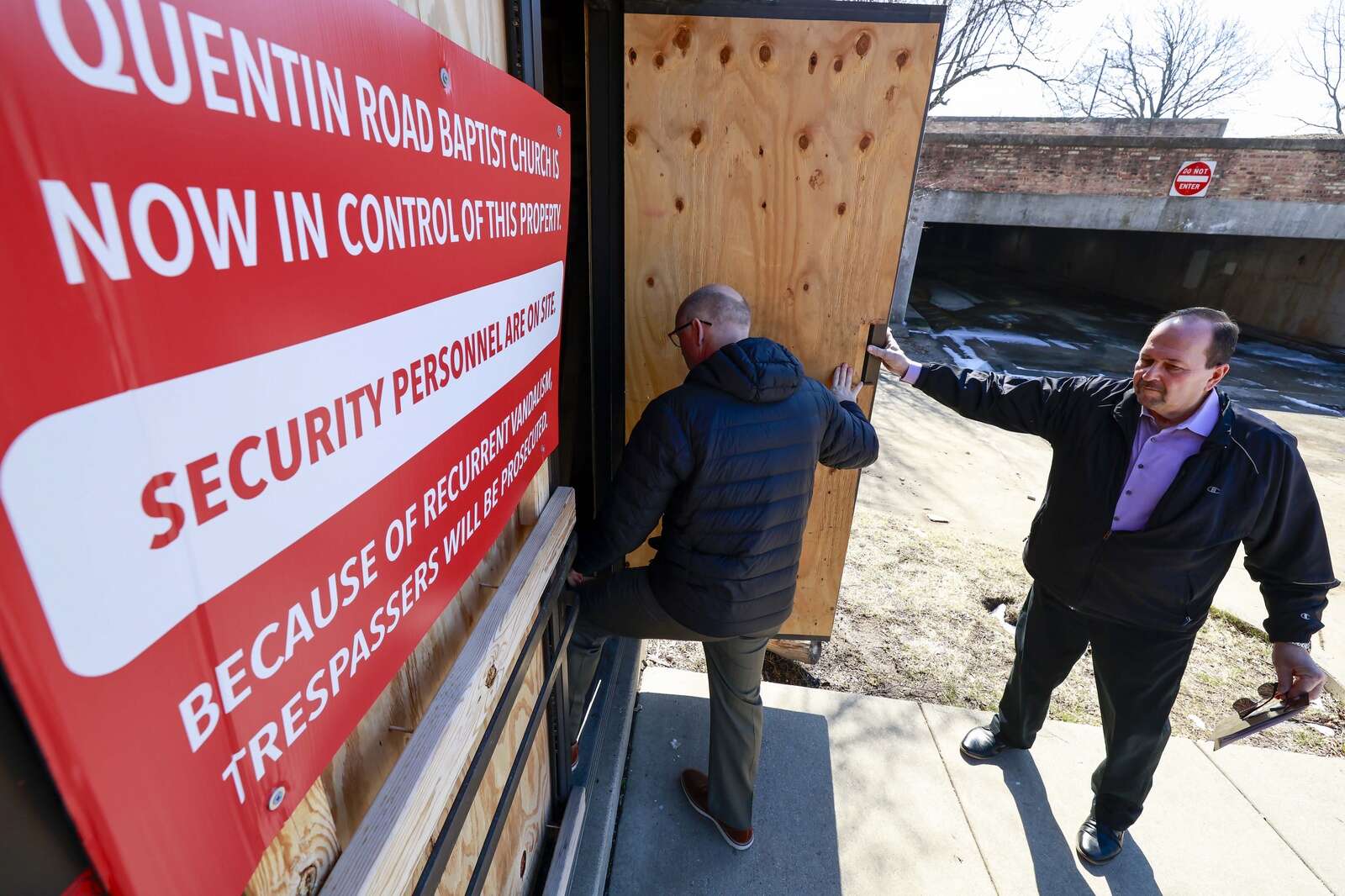Pastor Paul Julian enters as Joe Solimini holds the door open to the former CF Industries building overlooking Salem Lake Thursday, Mar. 19, 2026 in Long Grove. The long abandoned and vandalized 120,000 square foot CF Industries building in Long Grove will become the new home of Dayspring Bible College. The $8 million project will modernize the facility to include updated classrooms, dorm rooms, and much more. Half the cost is coming from the pending sale of college property to the forest preserve district for $4 million.