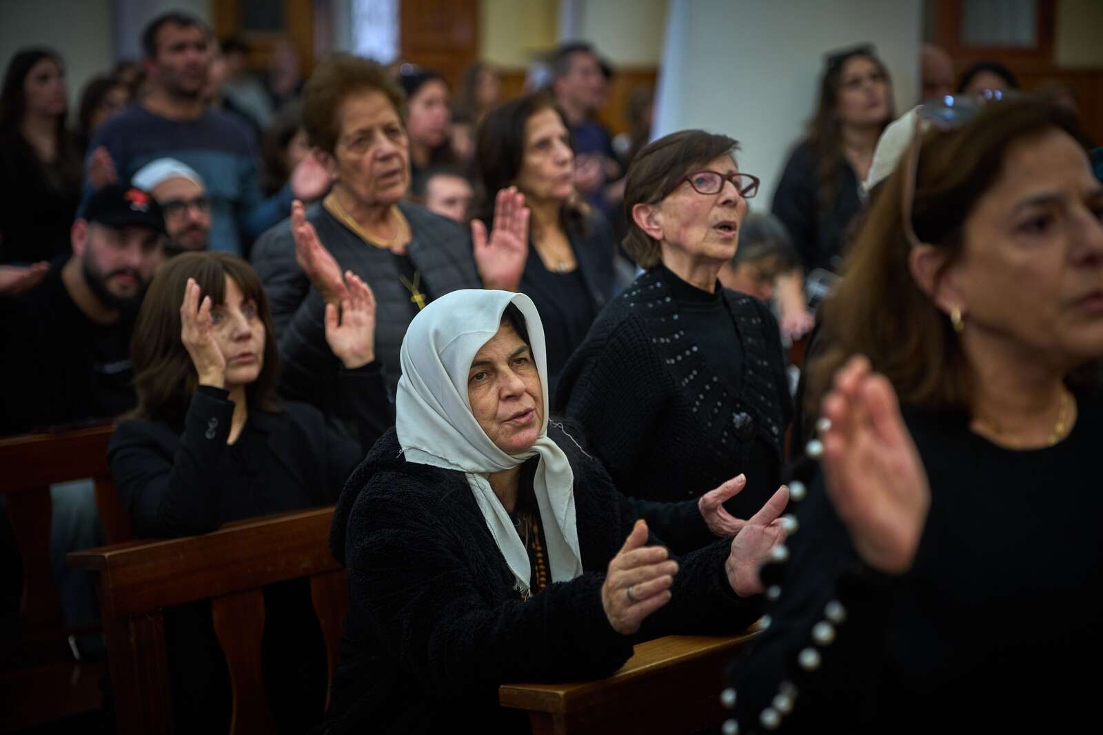 Worshipers pray during Good Friday Mass at St. Anthony Church, which was devoted to expressing solidarity with Christian villagers in southern Lebanon displaced by the war in Jdeideh, a suburb of Beirut, Lebanon, Friday, April 3, 2026. (AP Photo/Emilio Morenatti)