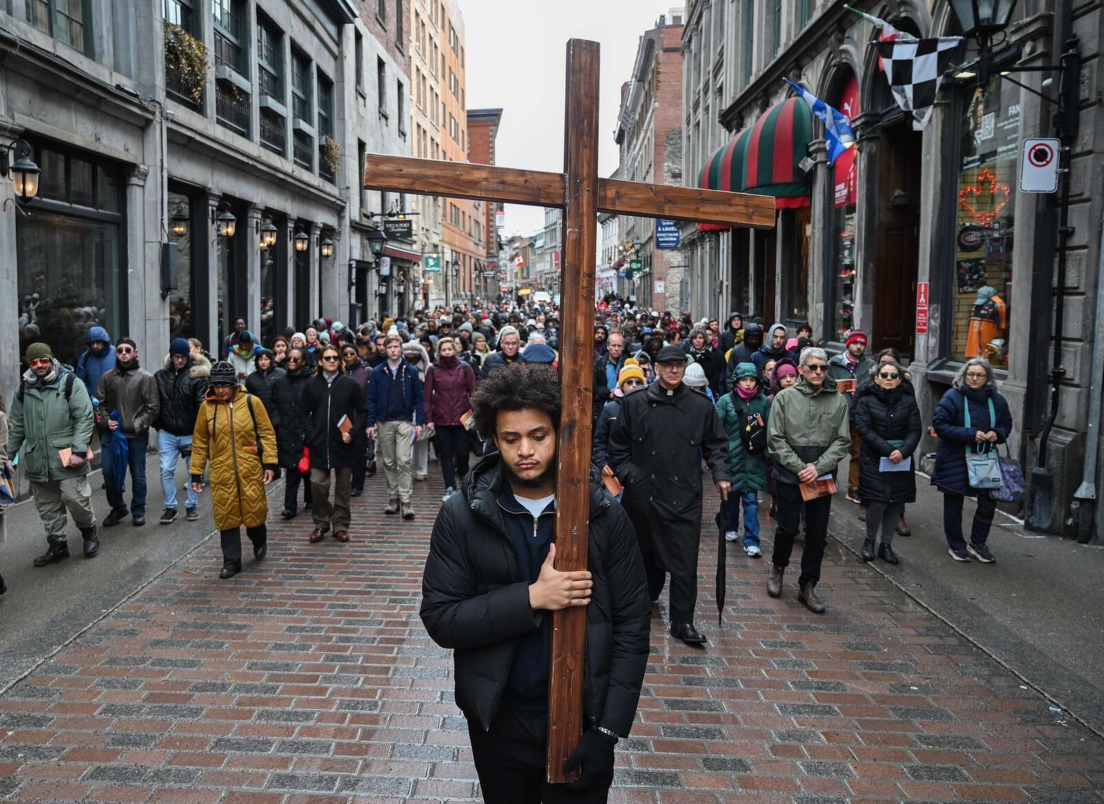 People take part in a Way of the Cross procession in Montreal, Friday, April 3, 2026. (Graham Hughes/The Canadian Press via AP)
