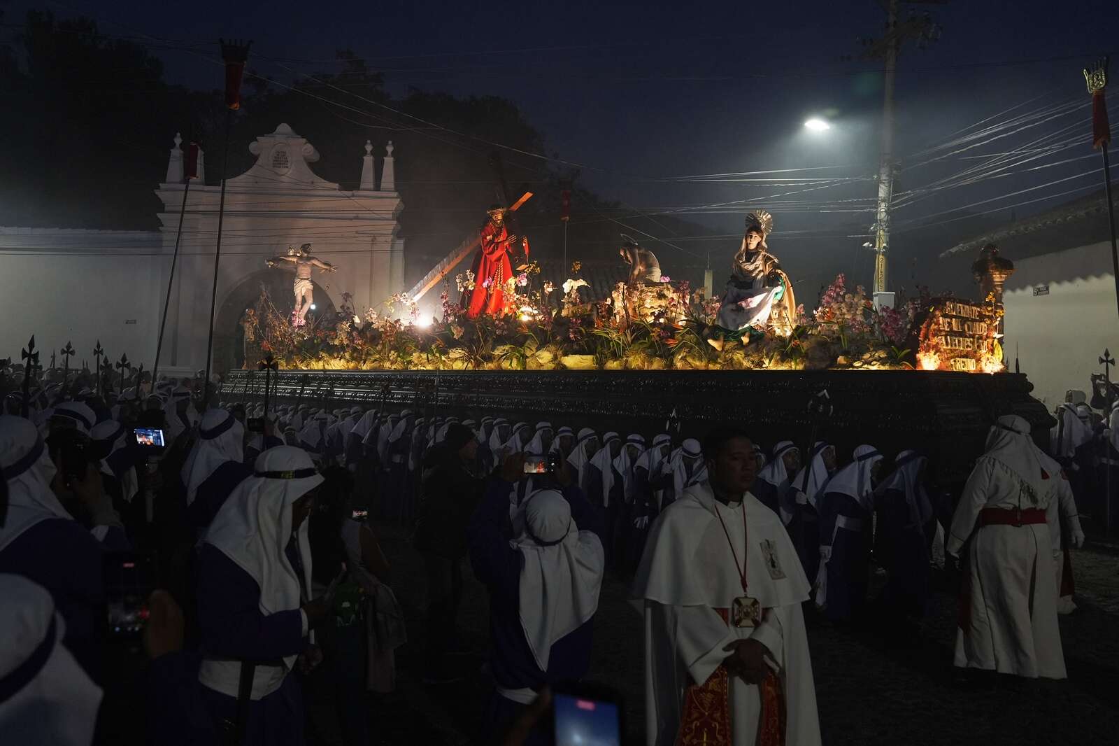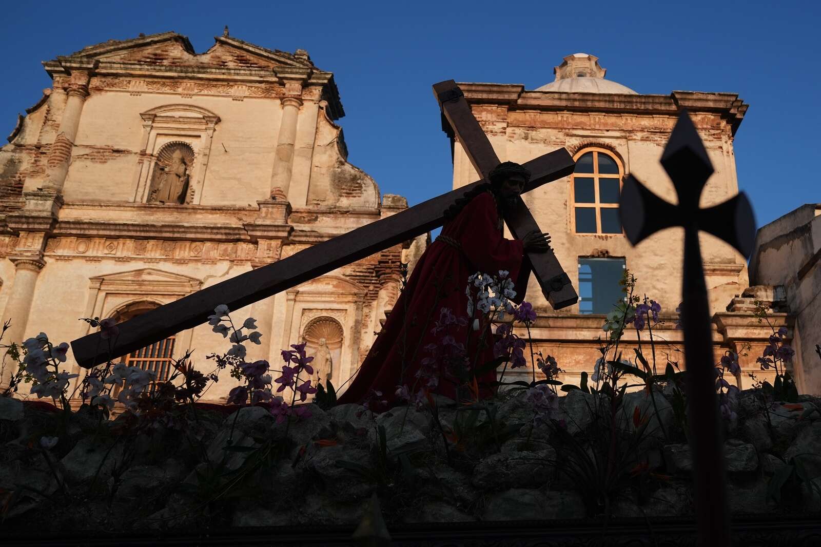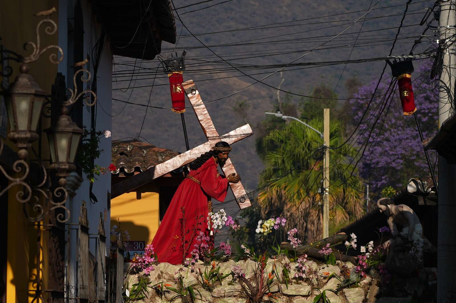 A statue of Jesus Christ with a cross makes its way past electric cables at La Merced church's Good Friday procession during Holy Week in Antigua, Guatemala, Friday, April 3, 2026. (AP Photo/Moises Castillo)