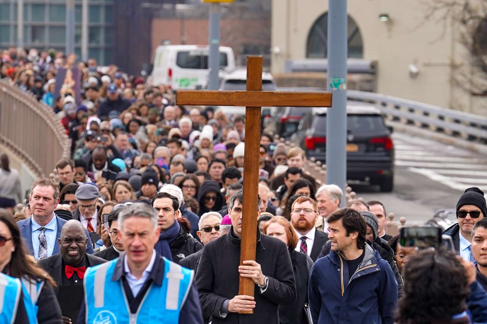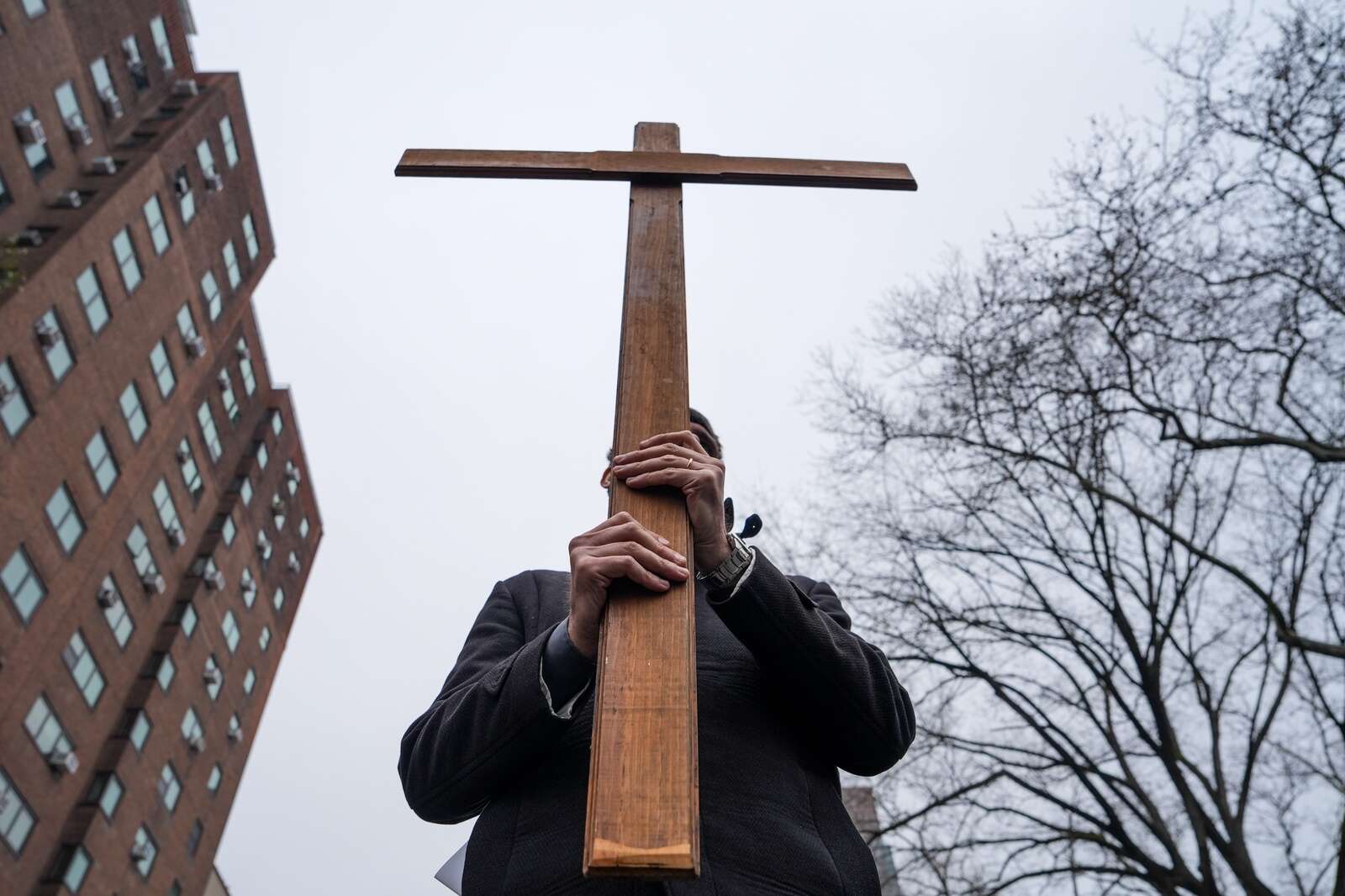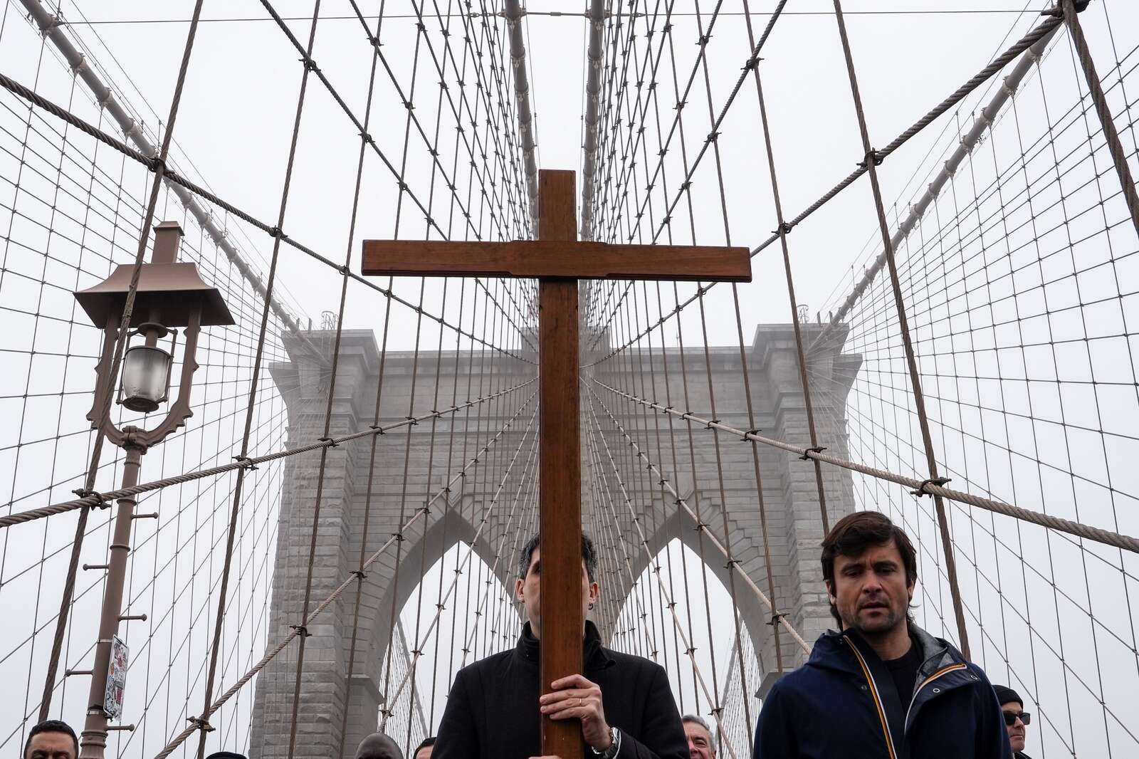 A man carries a cross during the "Way of the Cross" over the Brooklyn Bridge on Good Friday, Friday, April 3, 2026, in New York. (AP Photo/Ryan Murphy)