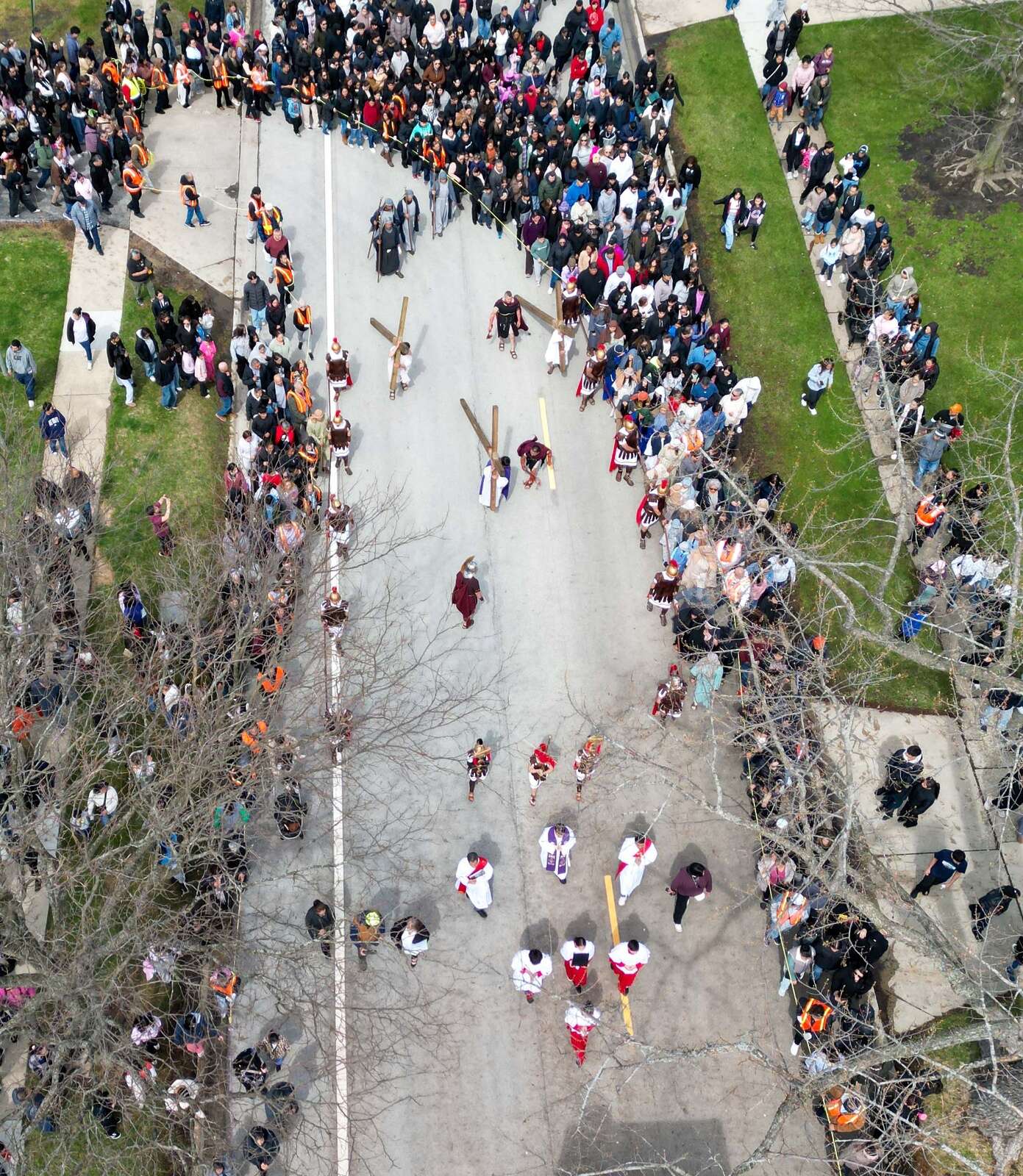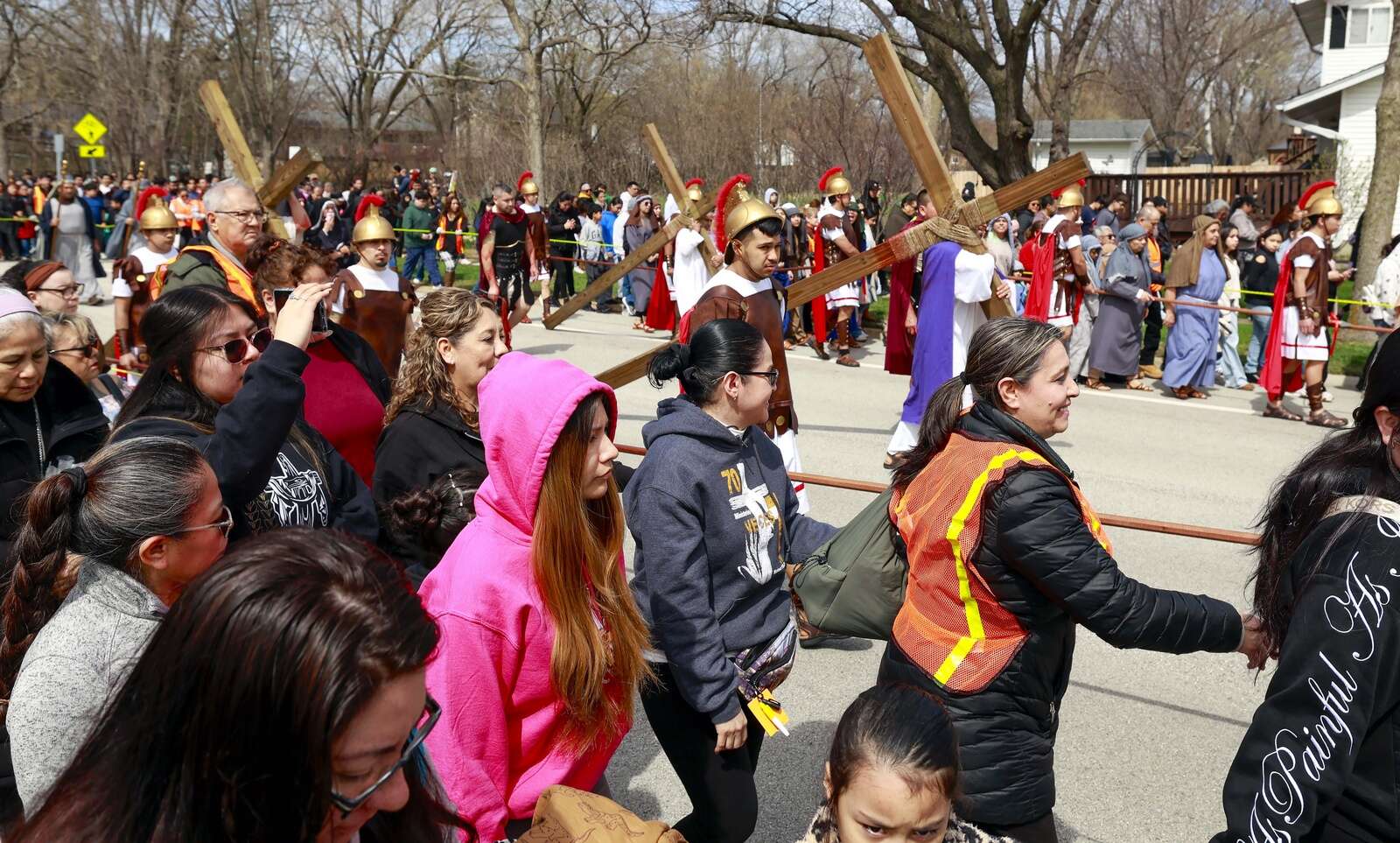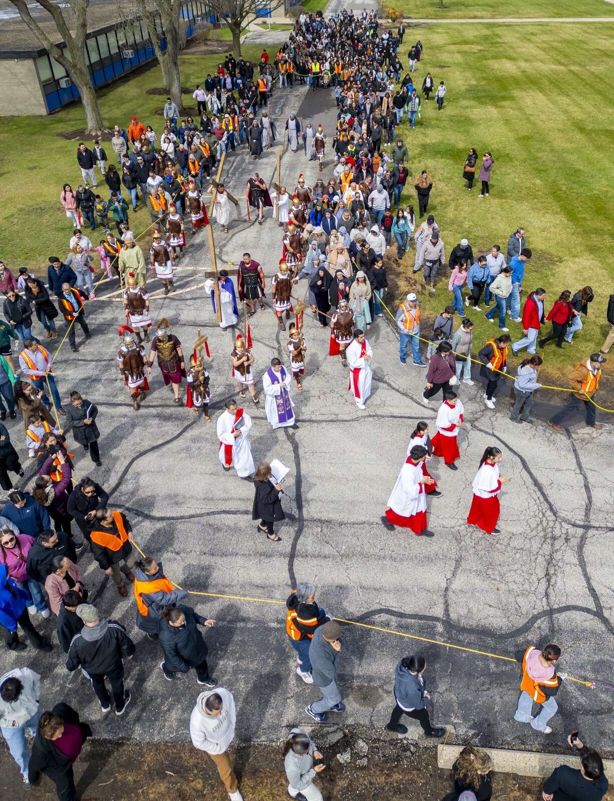 The Via Crucis march turns onto Anderson Drive as it departs St. Thomas of Villanova Church in Palatine Friday, April 3, 2026.
