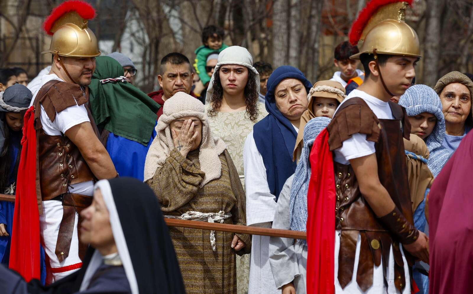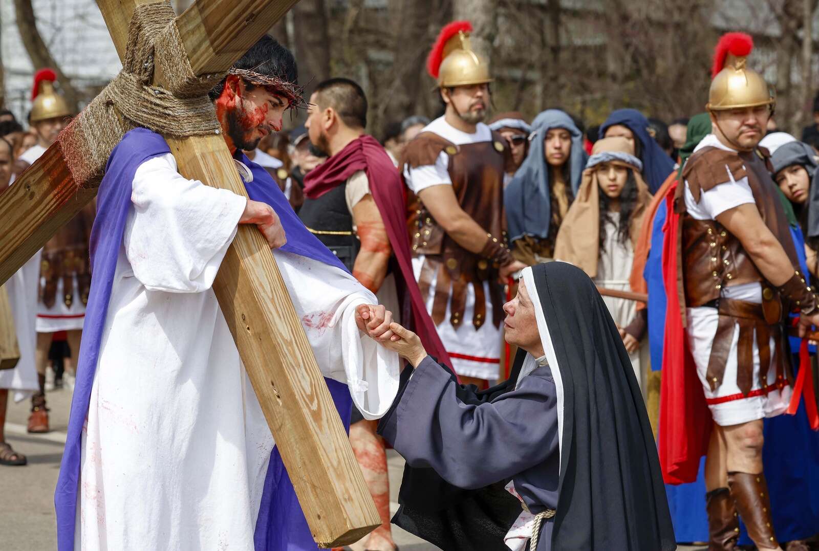 Nonoy Hernandez, portraying Mary, reaches to hold the hand of Jose Antonio Vital portraying Jesus, as Catholics observe Via Crucis on Friday April 3, 2026 in Palatine.