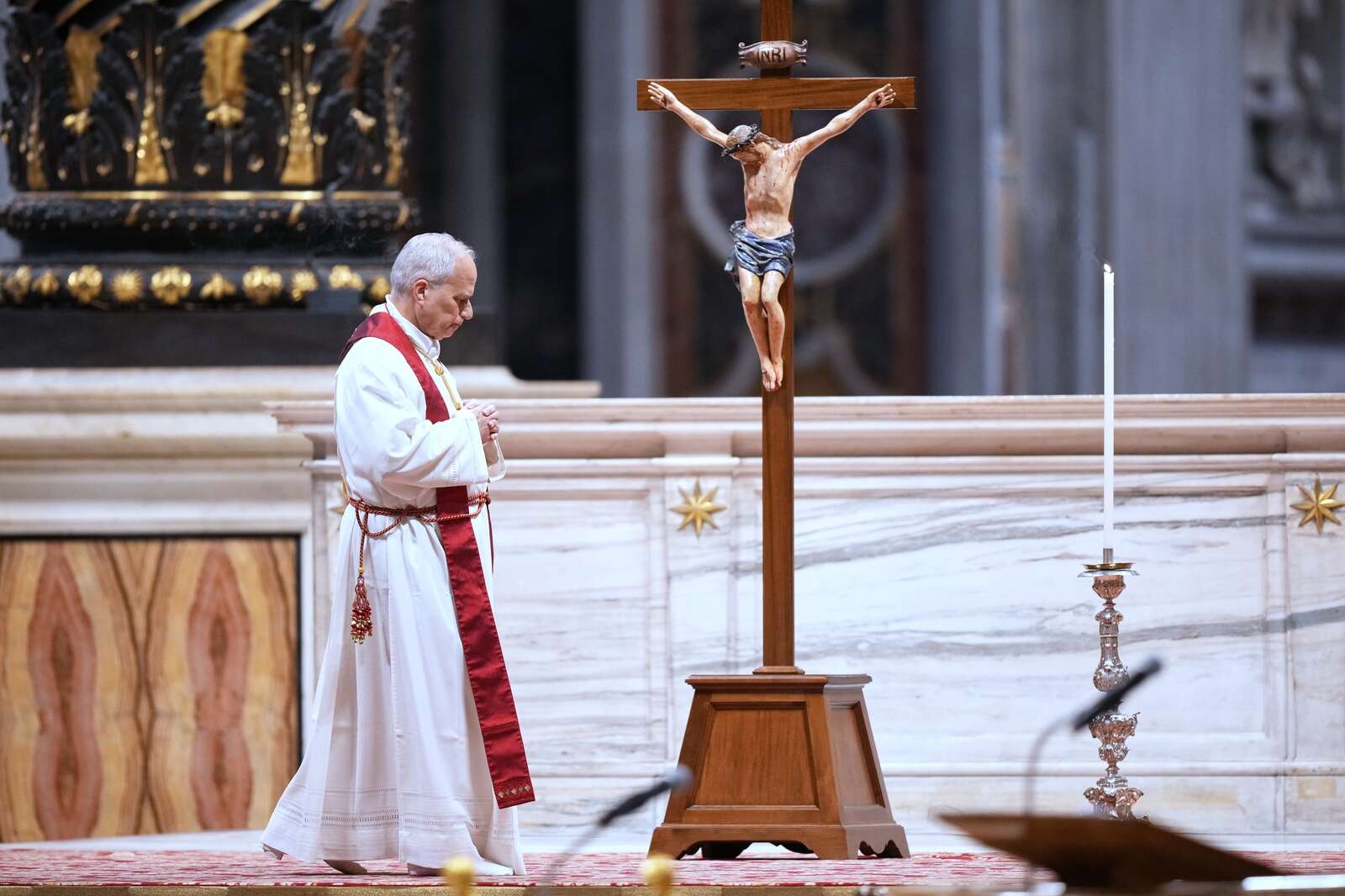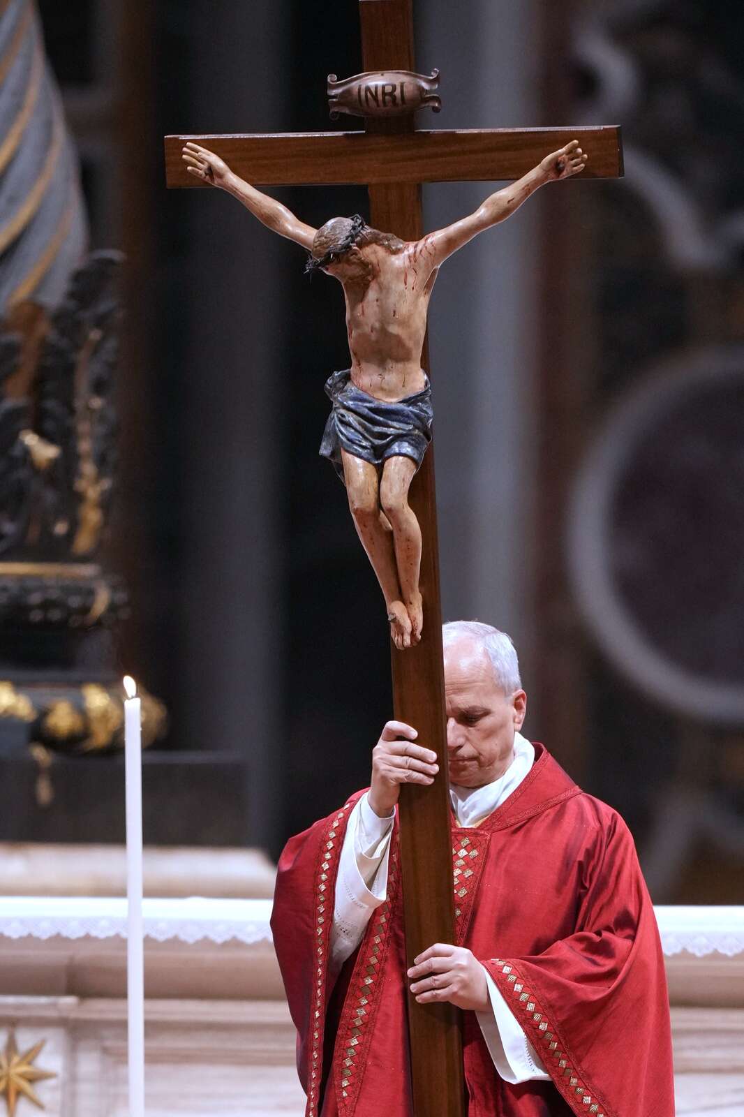 Pope Leo XIV attends the Celebration of the Passion of the Lord in St. Peter's Basilica at the Vatican on Catholic Good Friday, Friday, April 3, 2026 (AP Photo/Andrew Medichini)