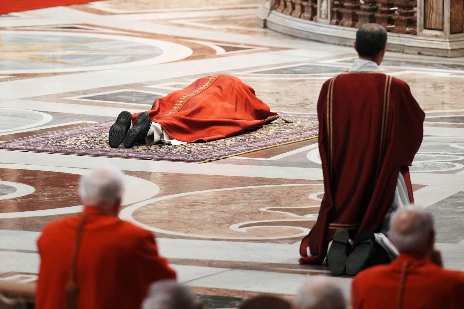 Pope Leo XIV lies prostrates at Celebration of the Passion of the Lord in St. Peter's Basilica at the Vatican on Catholic Good Friday, Friday, April 3, 2026 (AP Photo/Andrew Medichini)
