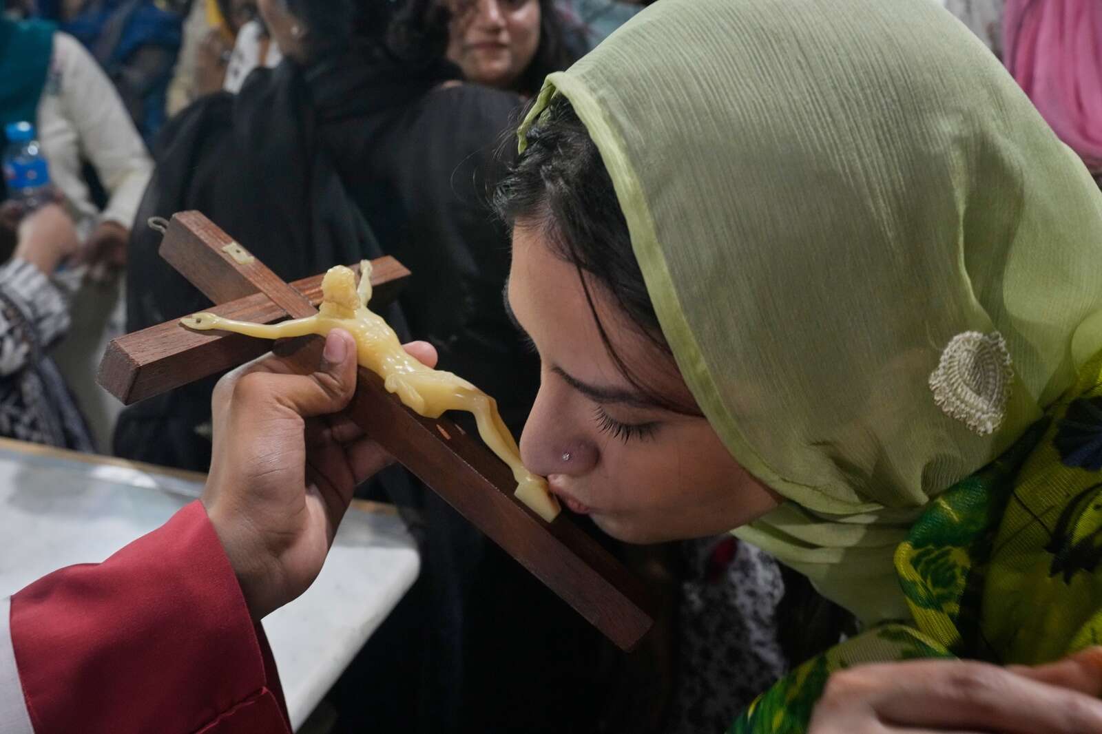 A Christian woman kisses a Jesus Christ cross during Good Friday service at Sacred Heart Cathedral, in Lahore, Pakistan, Friday, April 3, 2026. (AP Photo/K.M. Chaudary)