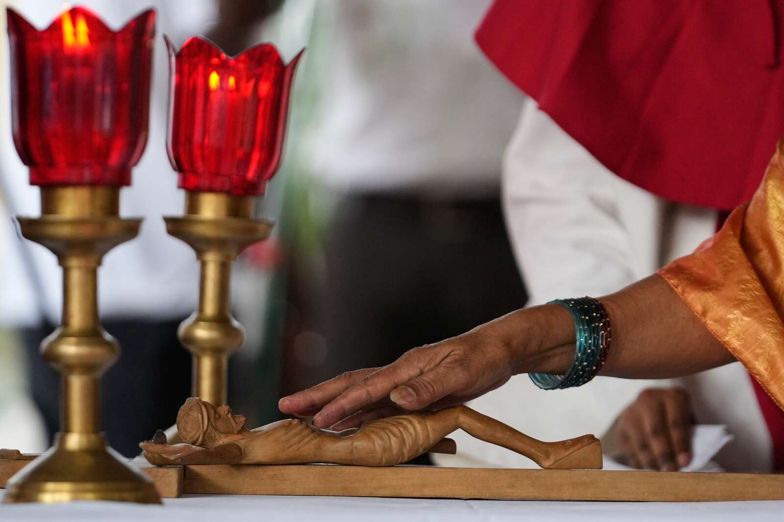 A Catholic devotee touch a crucifix during the veneration of the Holy Cross on Good Friday at Our Lady of Lourdes Church in Hyderabad, India, Friday, April 3, 2026. (AP Photo/Mahesh Kumar A.)
