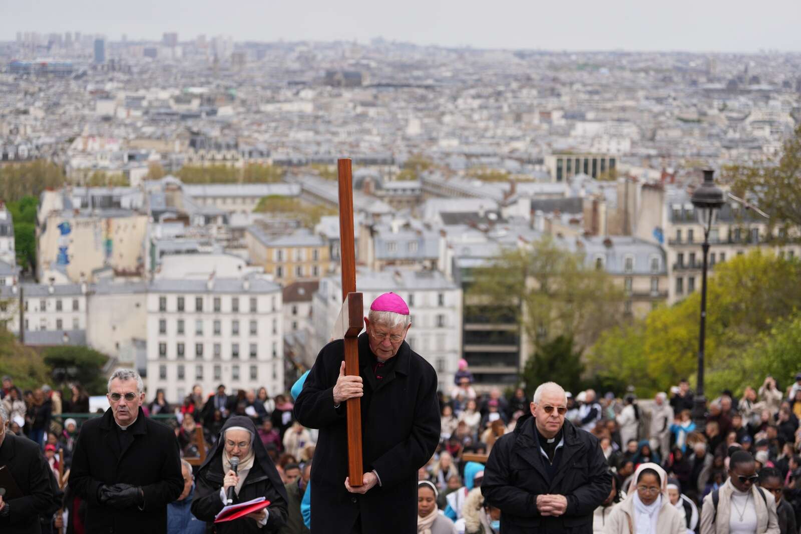 Paris Archbishop Laurent Ulrich, carries the cross during the Way of Cross ceremony to mark Good Friday, outside the Sacre Coeur basilica, in Paris, Friday, April 3, 2026 . (AP Photo/Thibault Camus)