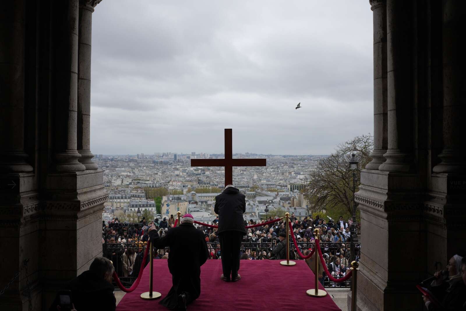 The cross is presented to the faithful during the Way of Cross ceremony to mark Good Friday, outside the Sacre Coeur basilica, Friday, April 3, 2026 . (AP Photo/Thibault Camus)