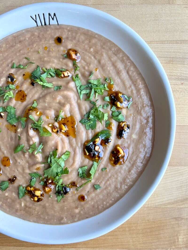 Let cool slightly and add beans and some of the water to a blender, adding more water if needed for desired consistency.