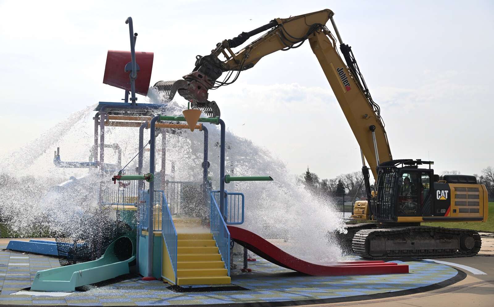 The 300-gallon, red bucket and the rest of the multicolored Tsunami Splash play area came down Wednesday. Demolition of the entire aquatic center at 105 Community Blvd. began last month.