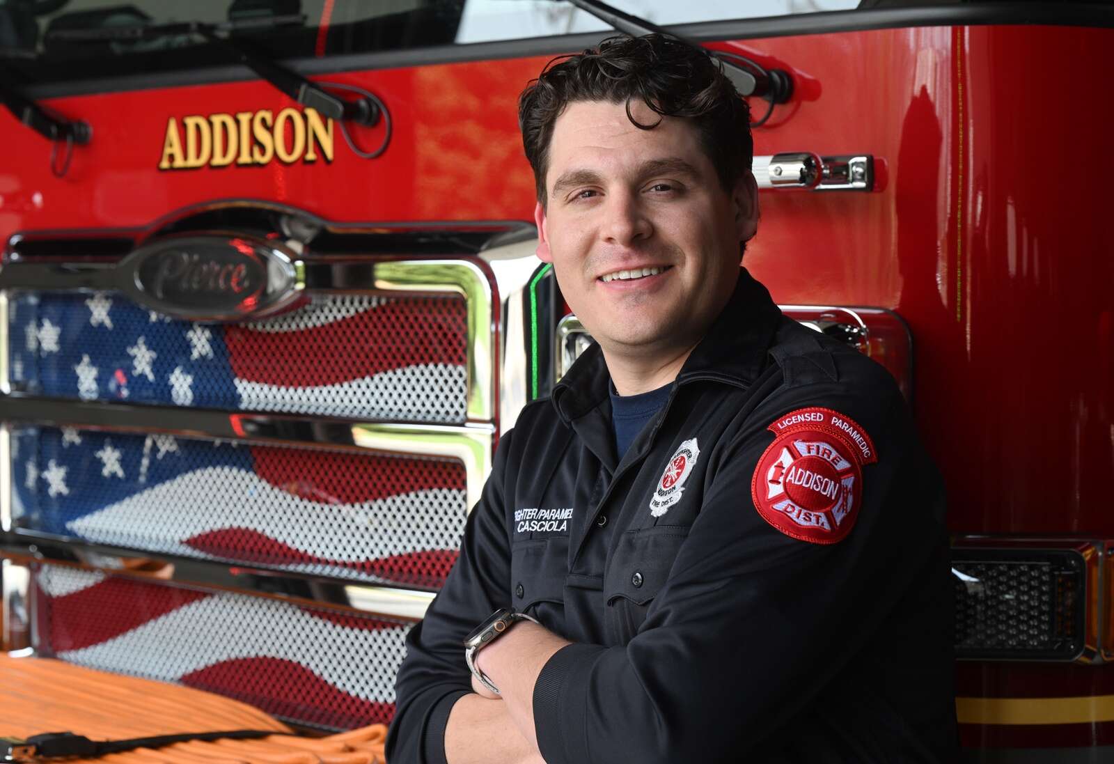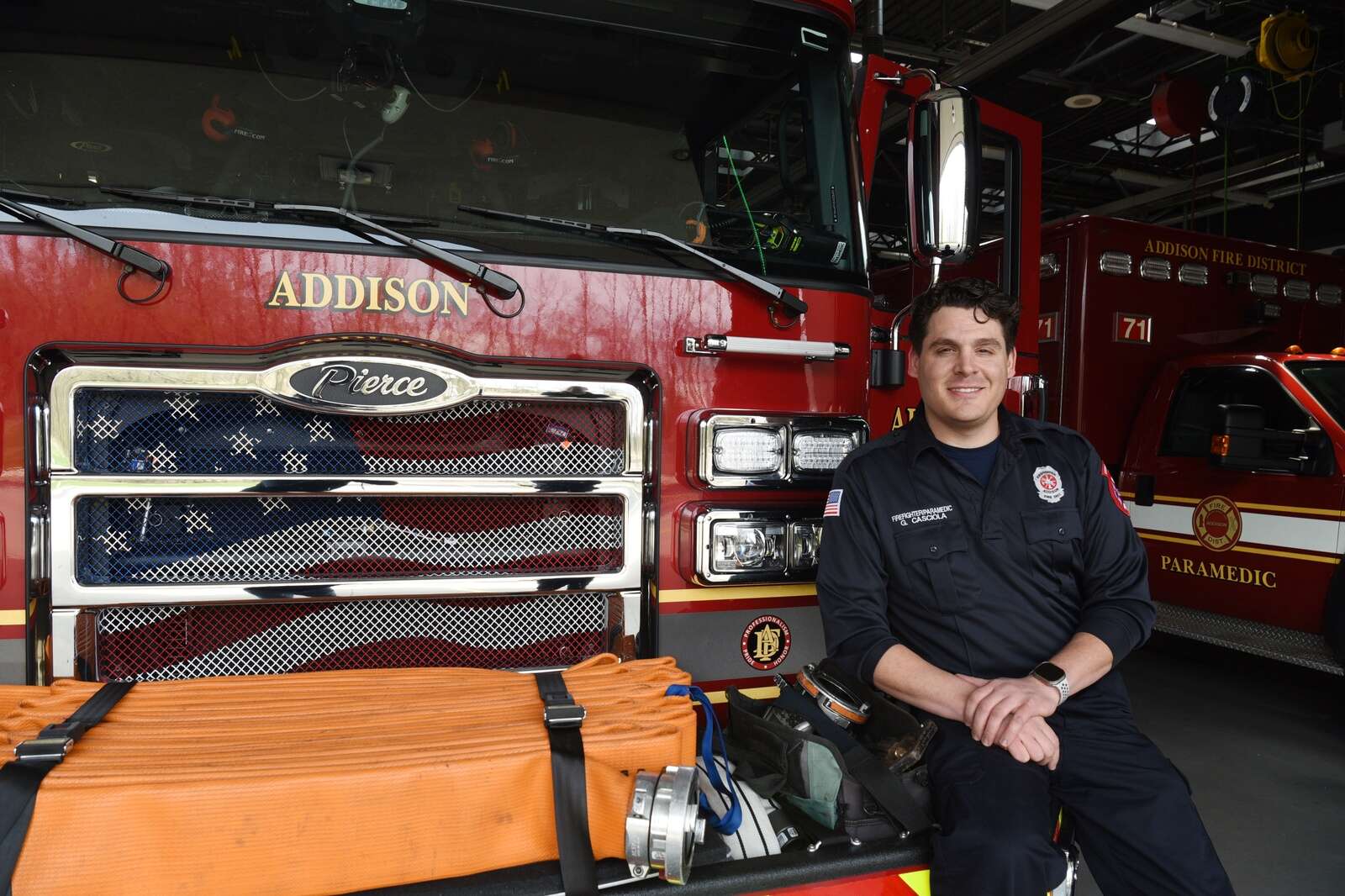 When his crew pulled up to a business engulfed in flames May 21, Addison Fire Protection District firefighter/paramedic Gino Casciola was given what he calls the “mundane” task of standing outside the burning building and feeding a hose to colleagues fighting the blaze from the inside.