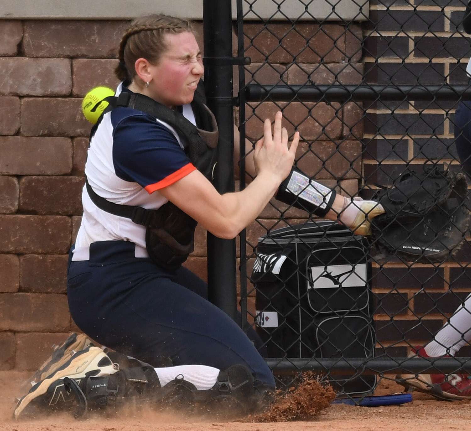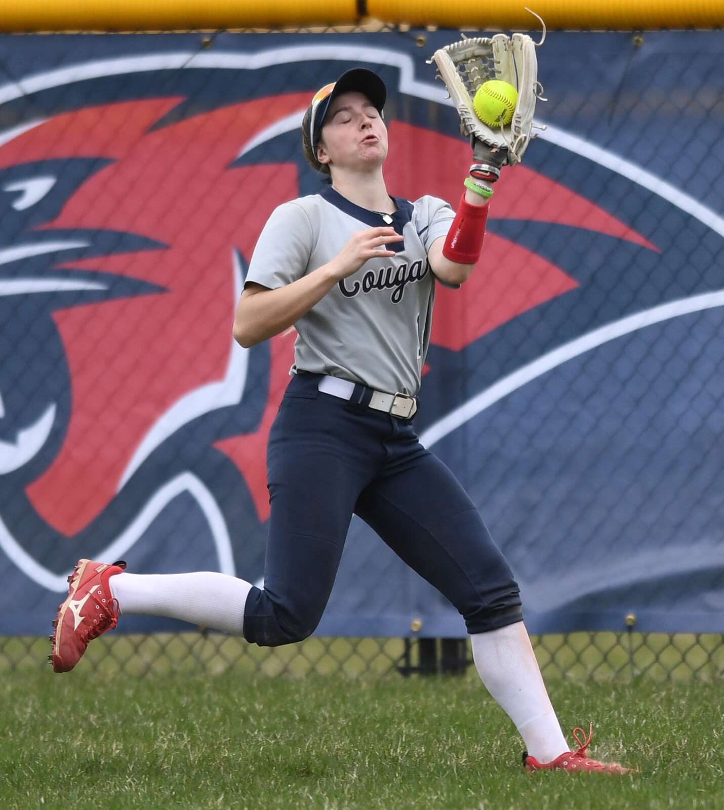 Cougars sophomore first baseman Payton Ackman, also a pitcher, made a superb diving grab of Natalie Whitson's smash, and then dove back to first base to touch the bag for the first out of the fifth inning.
