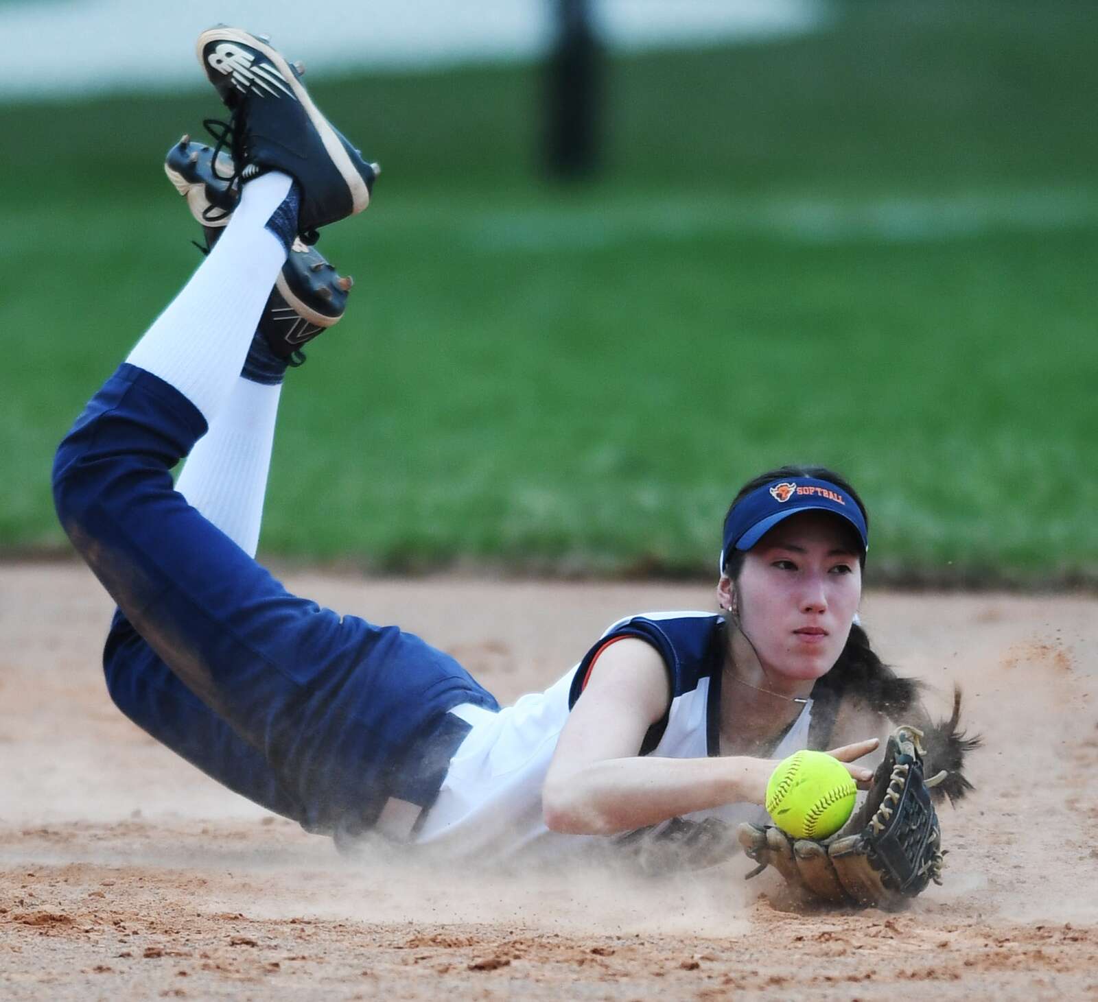 Buffalo Grove shortstop Lily Kim makes a diving stop of a ground ball but she was unable to force the Conant runner at second during Thursday’s game in Hoffman Estates. Joe Lewnard/jlewnard@dailyherald.com