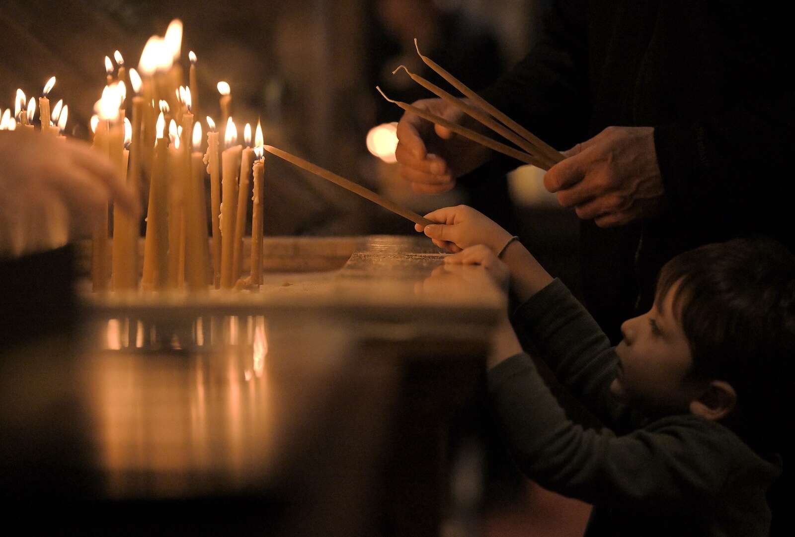 A boy lights candles with his father at St. Nectarios Greek Orthodox Church in Palatine before the traditional Holy Friday service on Apr. 10, 2026.