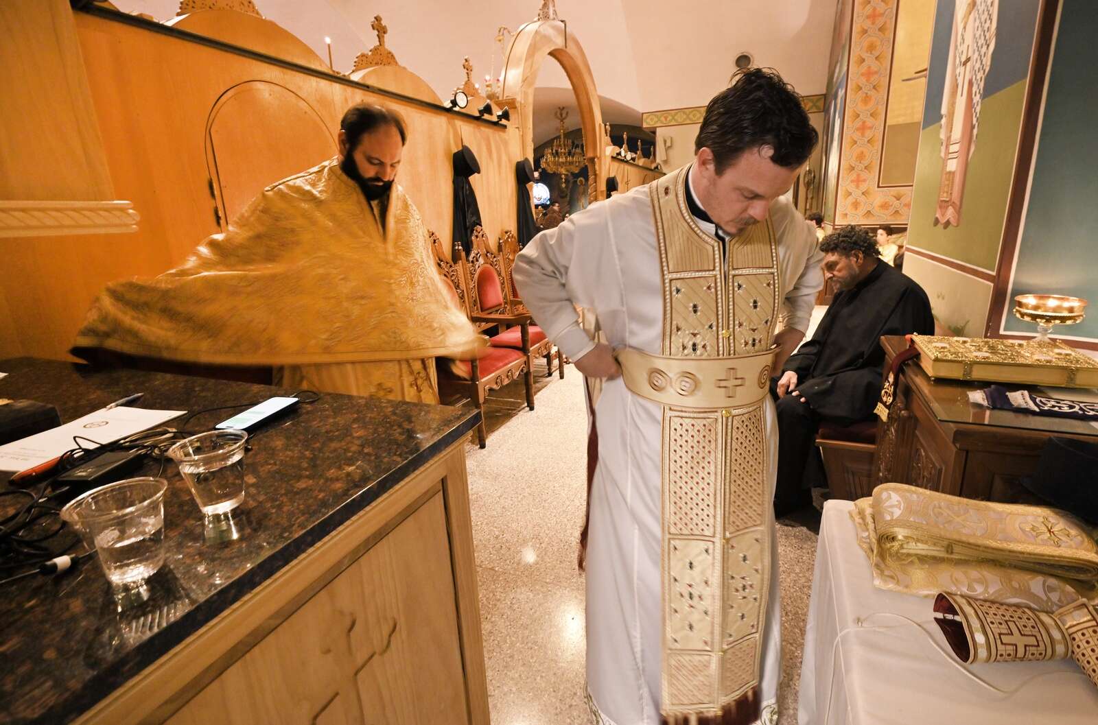 Behind the pulpit, Father Chris Mihalopoulos and Father Patrick O'Rourke, right, prepare their vestments for the traditional St. Nectarios Greek Orthodox Church Holy Friday service in Palatine on Apr. 10, 2026. With 1,500 parishioners expected, each priest will lead a duplcate service in separate parts of the church and will meet during a procession around the grounds at the end of the 90-minute service.
