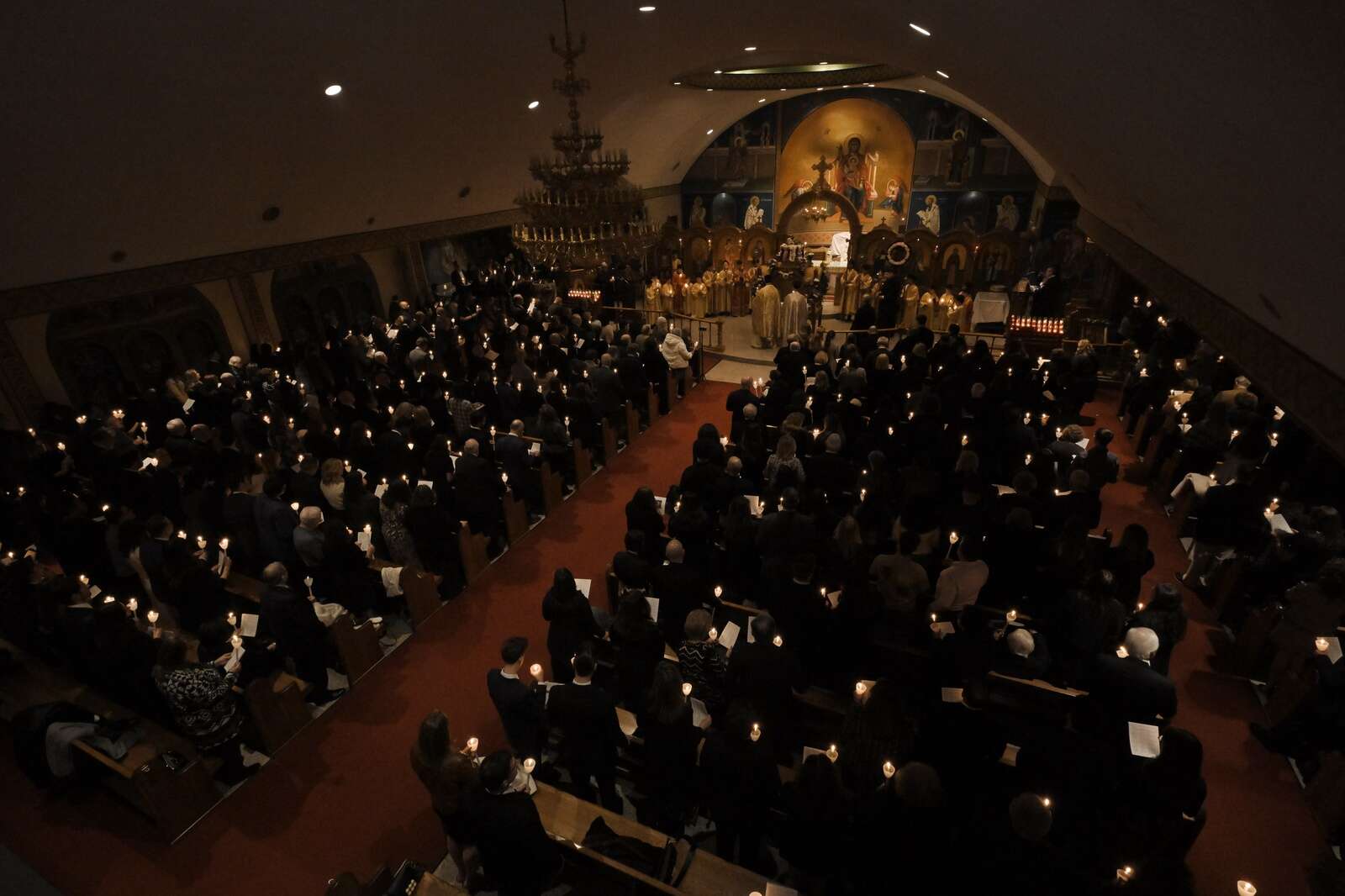 The congregation holds lighted candles during Holy Friday services at St. Nectarios Greek Orthodox Church in Palatine on Apr. 10, 2026. The church is experiencing remarkable growth filled their gymnasium with a duplicate service on this night.