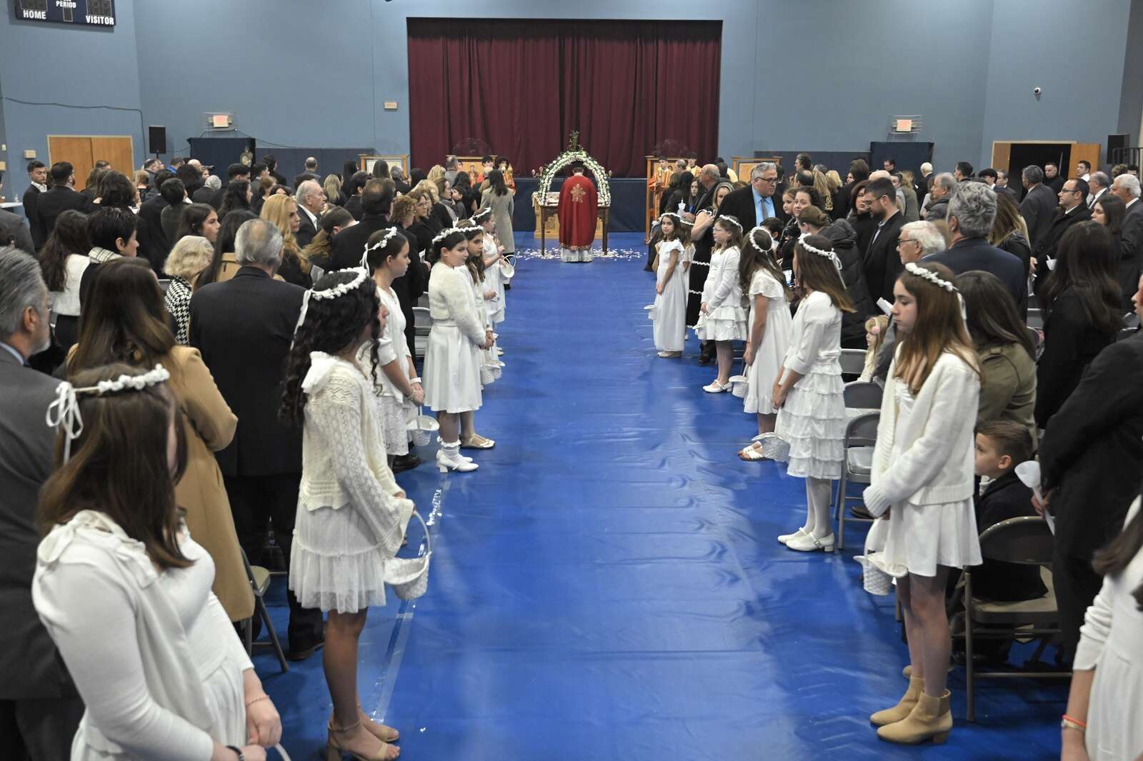 The gymnasium was used for overflow congregation members at St. Nectarios Greek Orthodox Church in Palatine for the traditional Holy Friday service on Apr. 10, 2026.