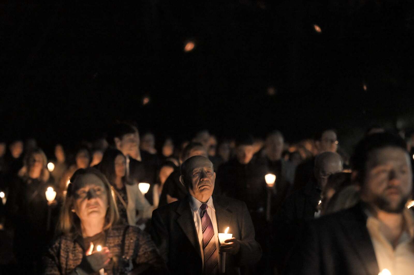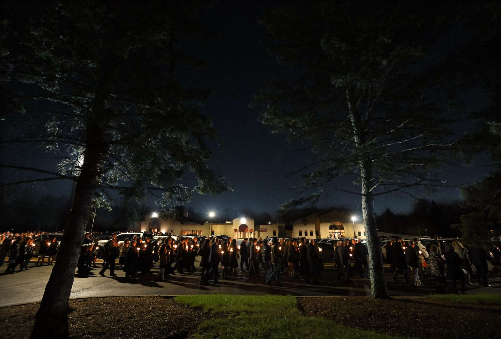 About 1,500 parishioners hold candles and wait to re-enter St. Nectarios Greek Orthodox Church in Palatine after following the Epitaphios, which represents the tomb of Christ, through the parking lot during a traditional Good Friday service on Apr. 10, 2026.