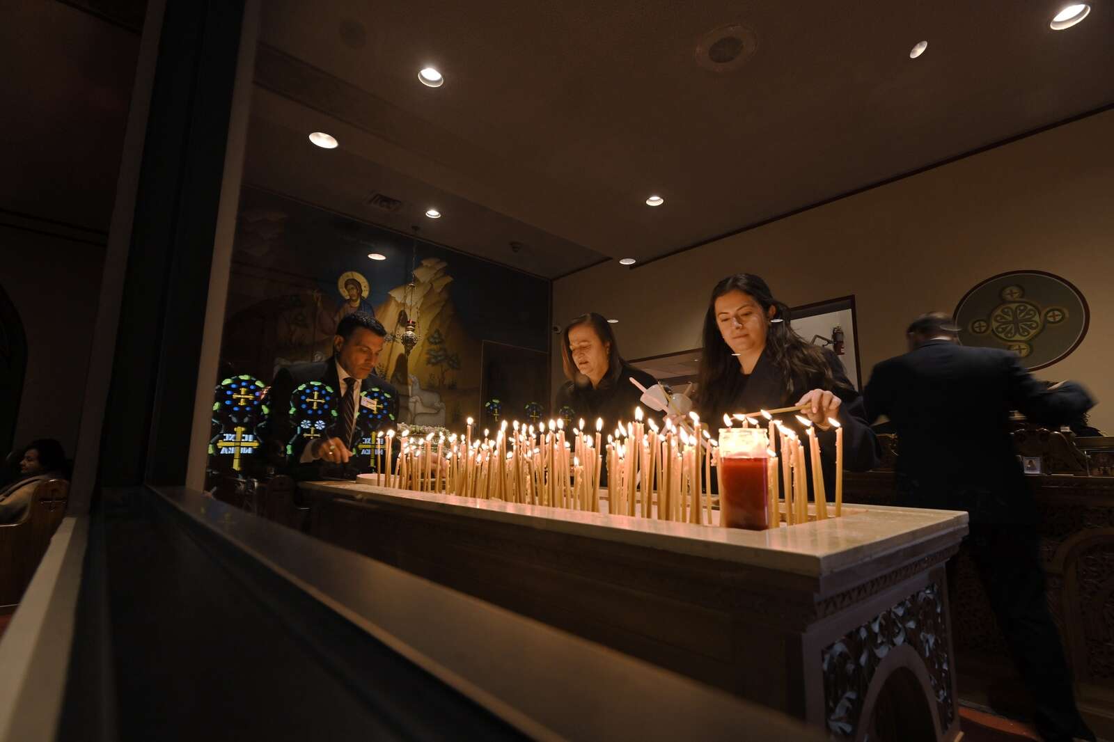 Parishoners light candles in the lobby of St. Nectarios Greek Orthodox Church in Palatine on the church’s traditional Holy Friday on Apr. 10, 2026. The Church is experiencing remarkable growth and 1,500 people attended the Easter Friday service and the traditional processional through the parking lot afterward.