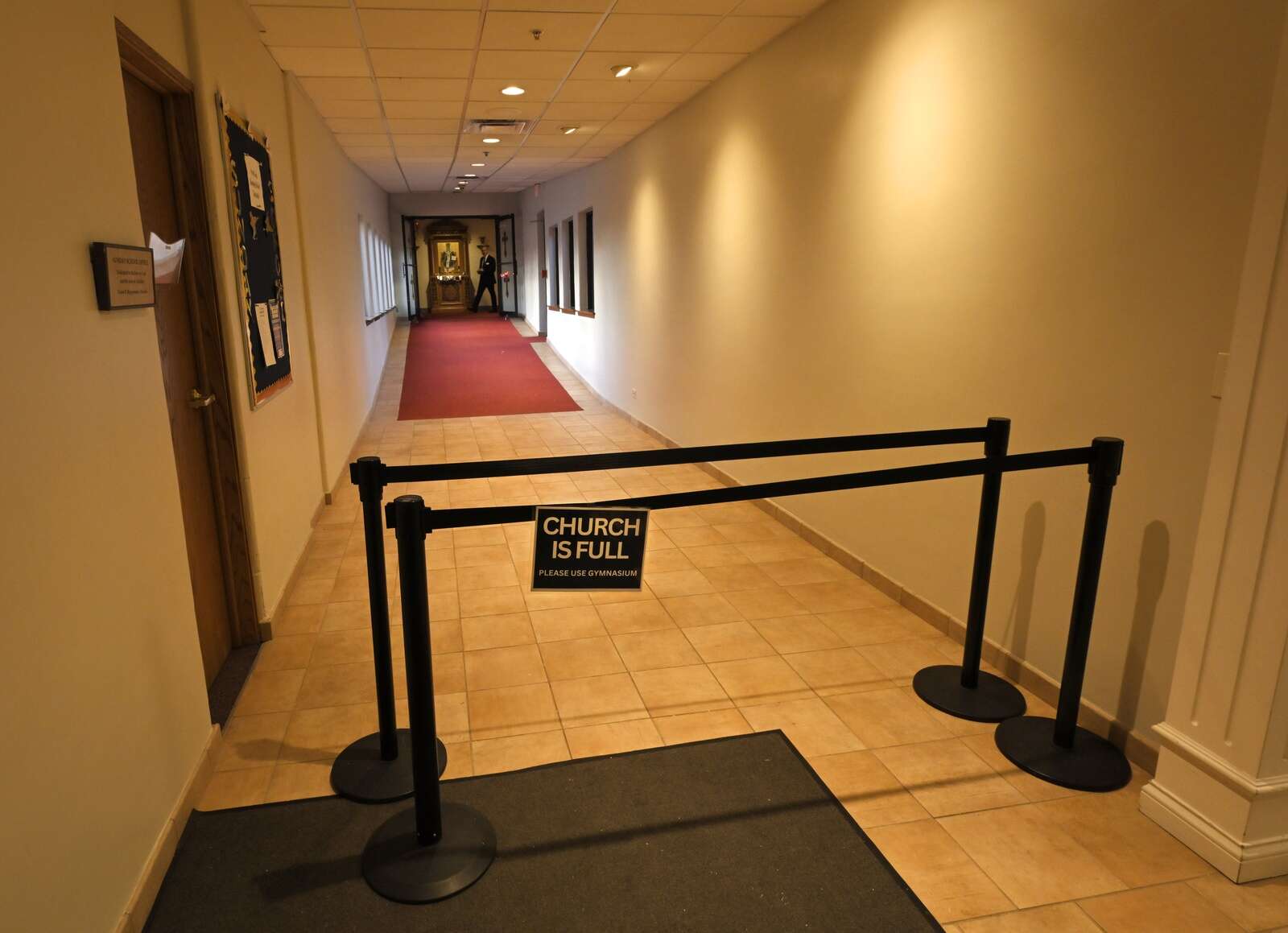 The hallway to the traditional sanctuary is closed and hundreds of parishioners will attend a duplicate service in the gymnasium at St. Nectarios Greek Orthodox Church in Palatine during the Holy Friday service on Apr. 10, 2026. The church is experiencing rapid growth.
